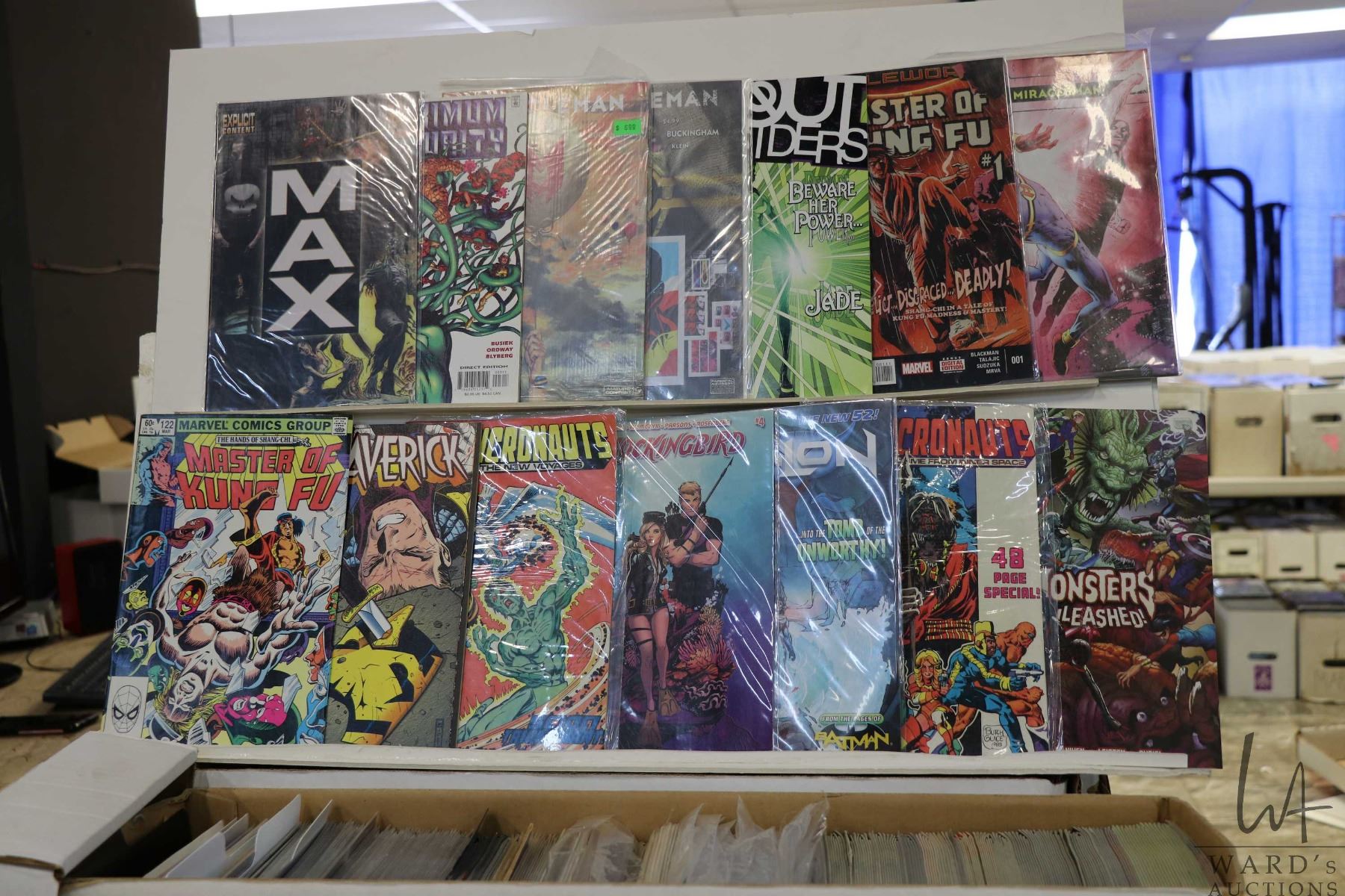 Box of approx. more than 300 comics including Talon, Outsiders, Masters of Kung-Fu, The Micronauts, Miracleman, Monsters Unleashed, etc. Important: Pickup is in Edmonton. Long comic boxes (28 x 8 x 11.5 and 23kg) will be shipped in 2 boxes approximately 11 x 9 x 12 and 13kg each through Canada Post. Long boxes can be palletized for large invoices. Details to follow