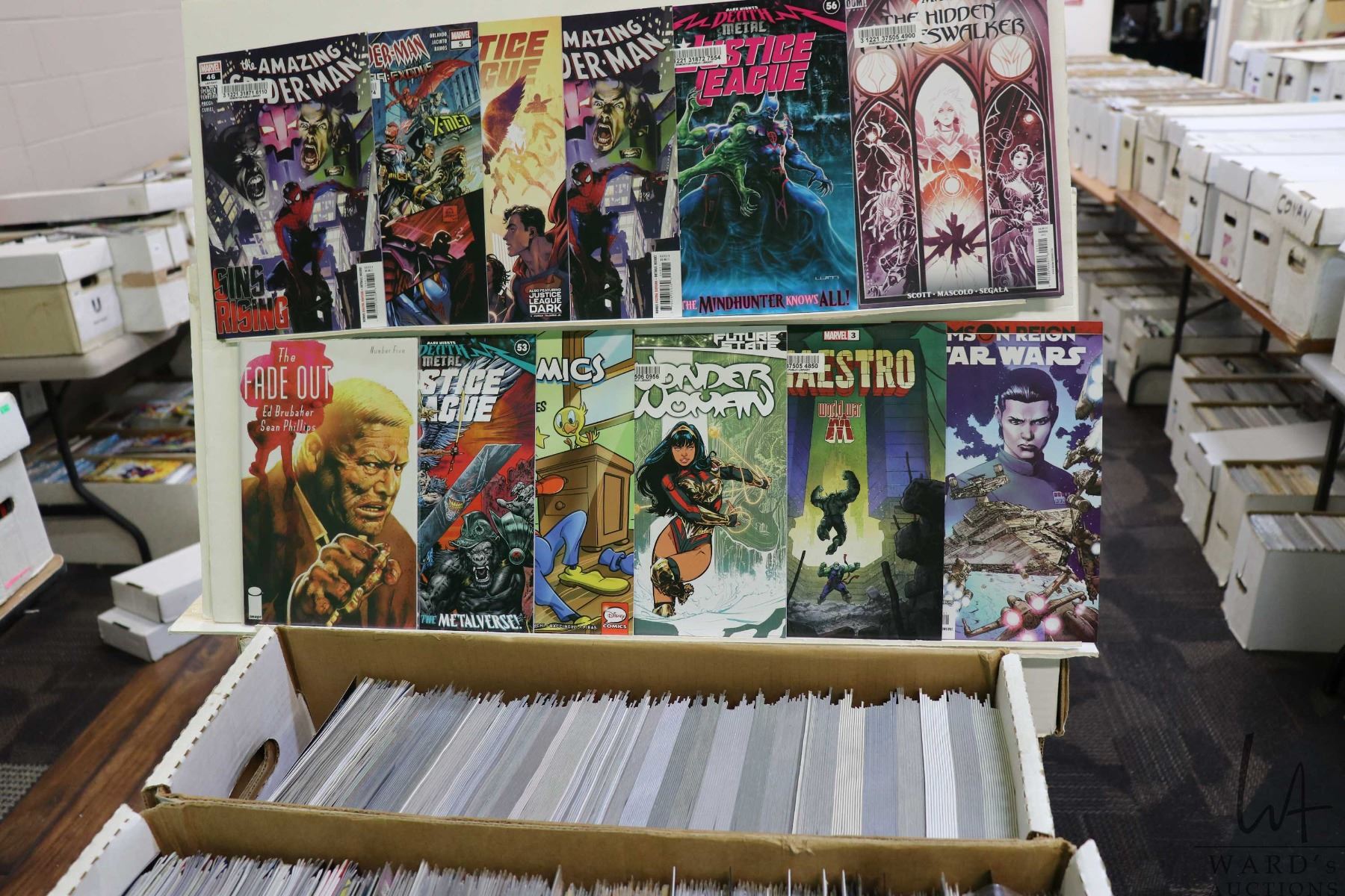 Box of approx. more than 300 comics including The Amazing Spiderman, Wonder Woman, Justice League, Maestro, The Hidden Plainswalker, Star Wars, etc. Important: Pickup is in Edmonton. Long comic boxes (28 x 8 x 11.5 and 23kg) will be shipped in 2 boxes approximately 11 x 9 x 12 and 13kg each through Canada Post. Long boxes can be palletized for large invoices. Details to follow