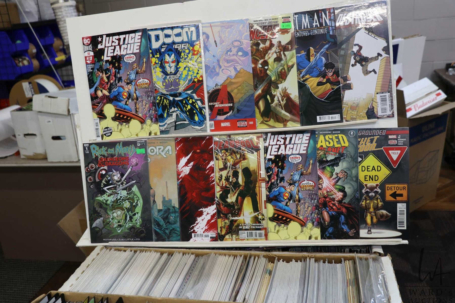 Box of approx. more than 300 comics including The Avengers, Justice League, Dceased Dead Planet, Batman, Destroyer, Rocket Racoon, etc. Important: Pickup is in Edmonton. Long comic boxes (28 x 8 x 11.5 and 23kg) will be shipped in 2 boxes approximately 11 x 9 x 12 and 13kg each through Canada Post. Long boxes can be palletized for large invoices. Details to follow