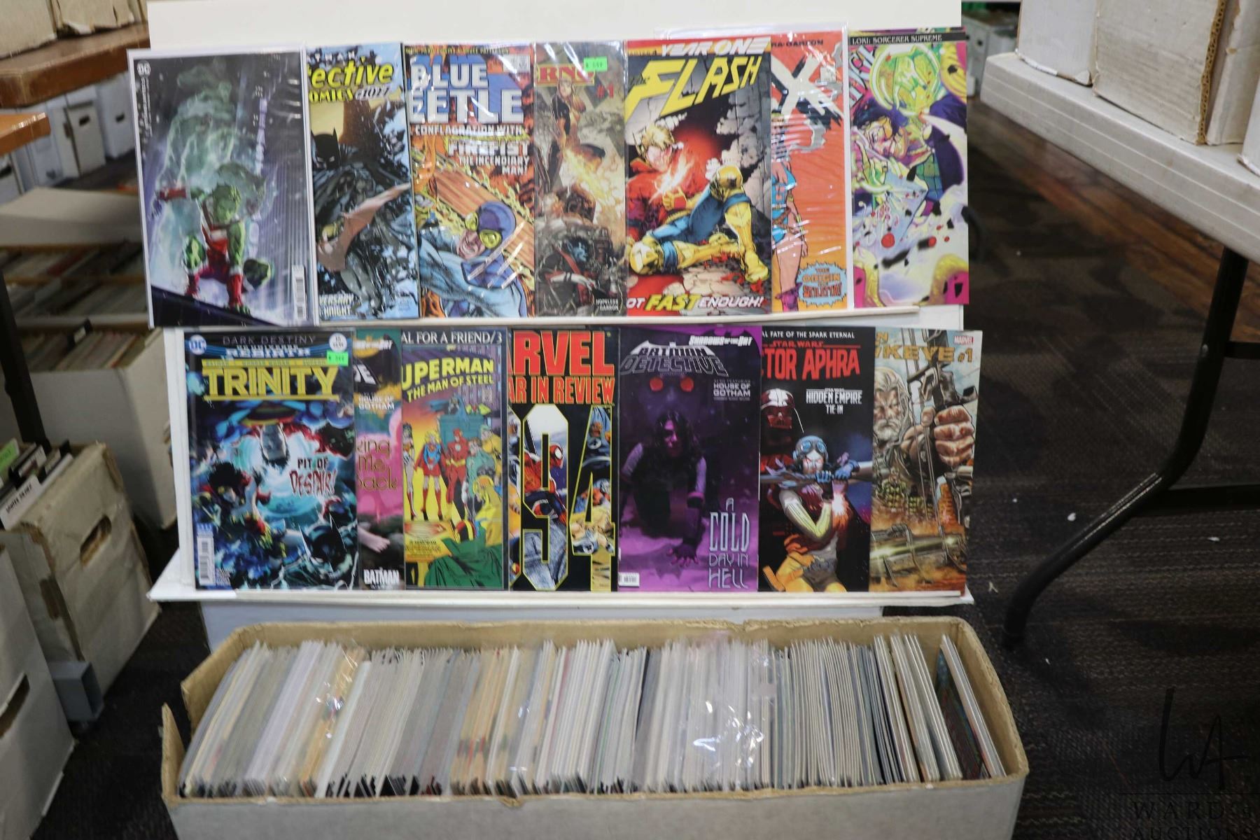 Box of approx. more than 300 comics including The Flash, Batman Detective, Hex, Star Wars Dr. Aphra, Dr. Strange, Old Man Hawkeye, etc. Important: Pickup is in Edmonton. Long comic boxes (28 x 8 x 11.5 and 23kg) will be shipped in 2 boxes approximately 11 x 9 x 12 and 13kg each through Canada Post. Long boxes can be palletized for large invoices. Details to follow