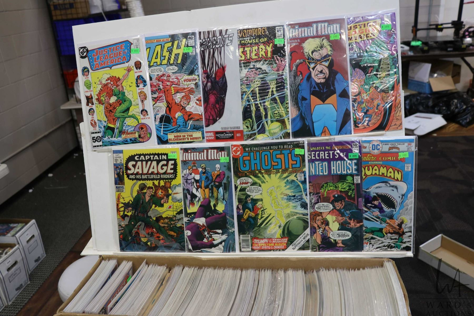Box of approx. more than 300 comics including The House of Mystery, Ghosts, Secrets of Haunted House, Animal Man, Aquaman, Justice League of America, etc. Important: Pickup is in Edmonton. Long comic boxes (28 x 8 x 11.5 and 23kg) will be shipped in 2 boxes approximately 11 x 9 x 12 and 13kg each through Canada Post. Long boxes can be palletized for large invoices. Details to follow