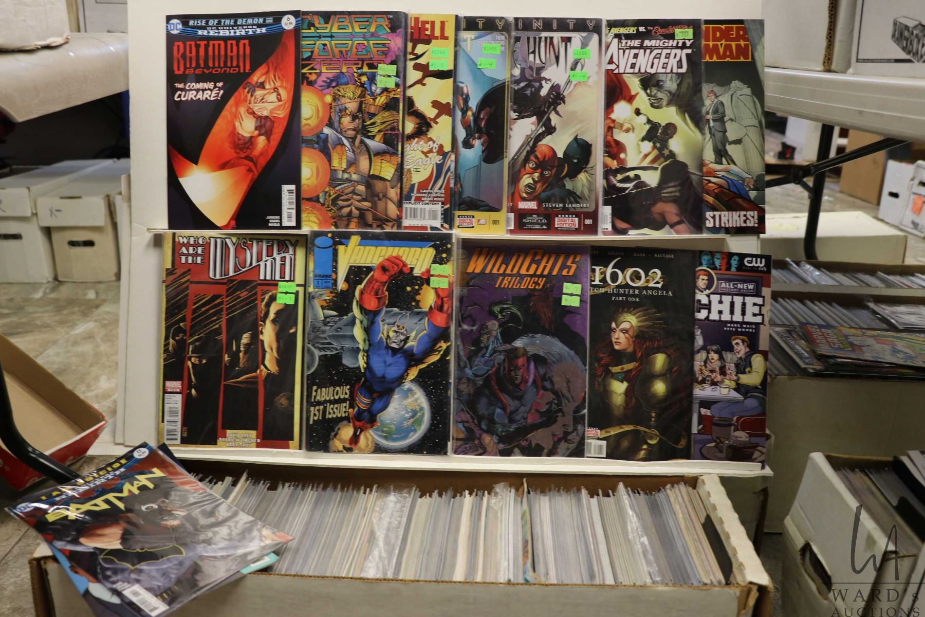 Box of approx. more than 300 comics including The Mighty Avengers, Wonder Woman, Witchhunter, Archie, Batman Rebirth, Black Panther and the Crew, etc. Important: Pickup is in Edmonton. Long comic boxes (28 x 8 x 11.5 and 23kg) will be shipped in 2 boxes approximately 11 x 9 x 12 and 13kg each through Canada Post. Long boxes can be palletized for large invoices. Details to follow