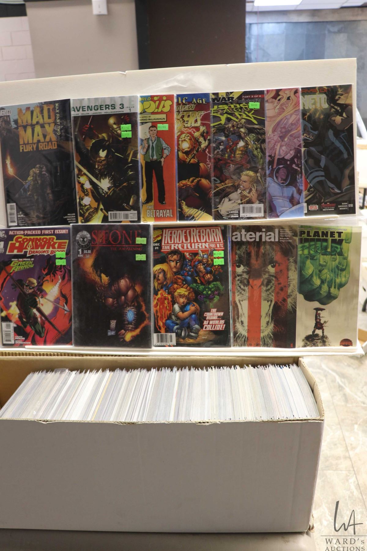 Box of approx. more than 300 comics including The New Avengers, Justice League, Kaptara, Material, Last Days of Magneto, Plantet Hulk, etc. Important: Pickup is in Edmonton. Long comic boxes (28 x 8 x 11.5 and 23kg) will be shipped in 2 boxes approximately 11 x 9 x 12 and 13kg each through Canada Post. Long boxes can be palletized for large invoices. Details to follow