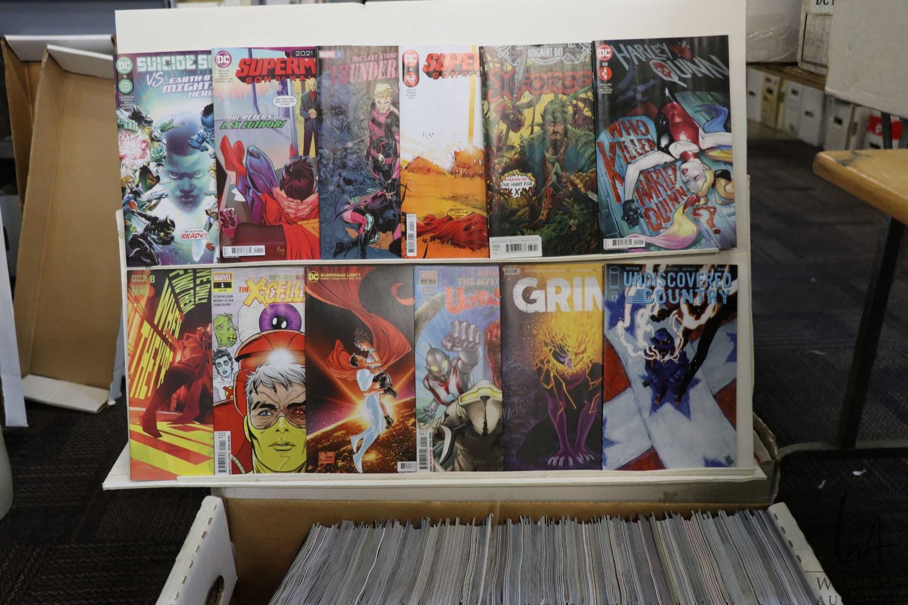 Box of approx. more than 300 comics including Thunderbolts, Superman, Superman Son of Kaiel, The X-Cellent, Suicide Squad, Boom, etc. Important: Pickup is in Edmonton. Long comic boxes (28 x 8 x 11.5 and 23kg) will be shipped in 2 boxes approximately 11 x 9 x 12 and 13kg each through Canada Post. Long boxes can be palletized for large invoices. Details to follow