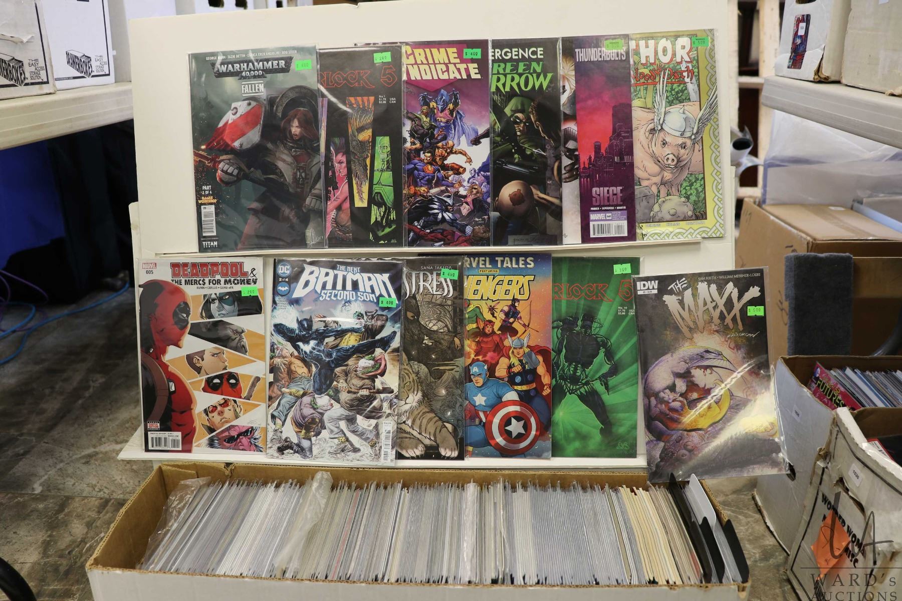 Box of approx. more than 300 comics including Warhammer 40,000, Warlock 5, Crime Syndicate, Convergence, Thunderbolts, Thor, etc. Important: Pickup is in Edmonton. Long comic boxes (28 x 8 x 11.5 and 23kg) will be shipped in 2 boxes approximately 11 x 9 x 12 and 13kg each through Canada Post. Long boxes can be palletized for large invoices. Details to follow