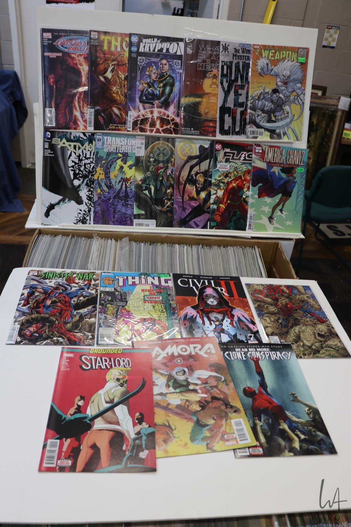 Box of approx. more than 300 comics including World of Krypton, X-Men, Thor, Transformers, Fantastic Four, Batman, etc. Important: Pickup is in Edmonton. Long comic boxes (28 x 8 x 11.5 and 23kg) will be shipped in 2 boxes approximately 11 x 9 x 12 and 13kg each through Canada Post. Long boxes can be palletized for large invoices. Details to follow