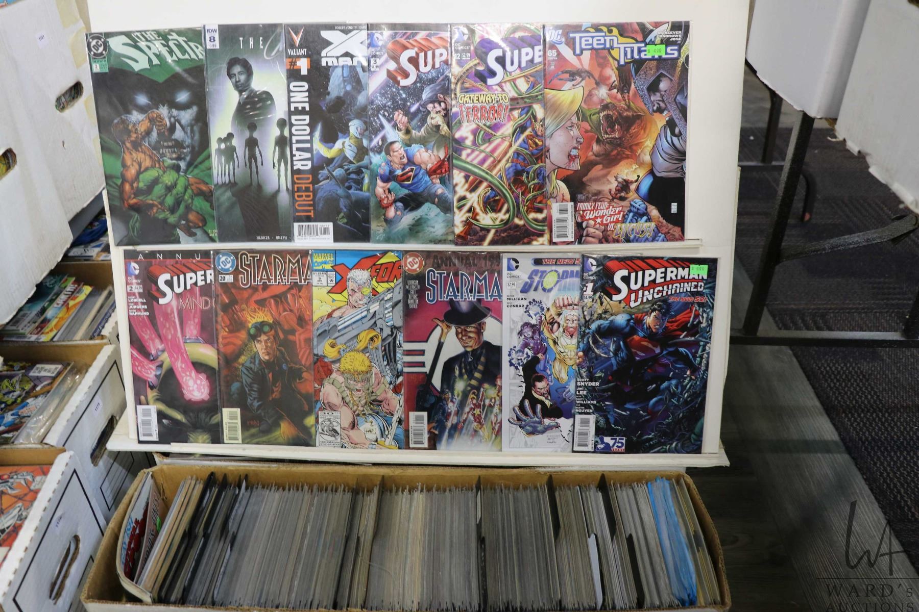 Box of approx. more than 300 comics including X-Force, X-O, Manowar, The X-Files, The Spectre, Starman, Superman, etc. Important: Pickup is in Edmonton. Long comic boxes (28 x 8 x 11.5 and 23kg) will be shipped in 2 boxes approximately 11 x 9 x 12 and 13kg each through Canada Post. Long boxes can be palletized for large invoices. Details to follow