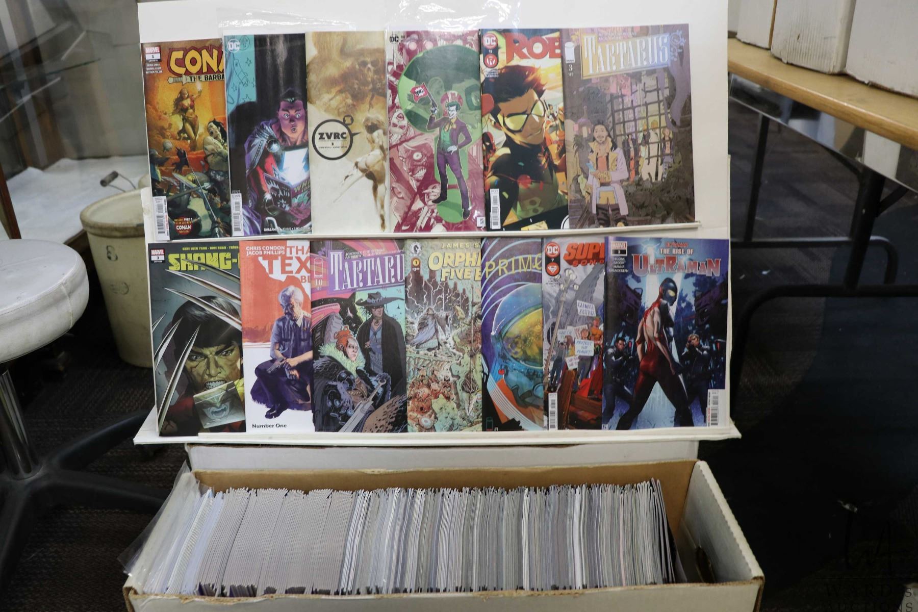 Box of approx. more than 300 comics including Zombies vs Robots Classics, Tartarus, That Texas Blood, Shazam, Conan the Barbarian, Shang-Chi, etc. Important: Pickup is in Edmonton. Long comic boxes (28 x 8 x 11.5 and 23kg) will be shipped in 2 boxes approximately 11 x 9 x 12 and 13kg each through Canada Post. Long boxes can be palletized for large invoices. Details to follow