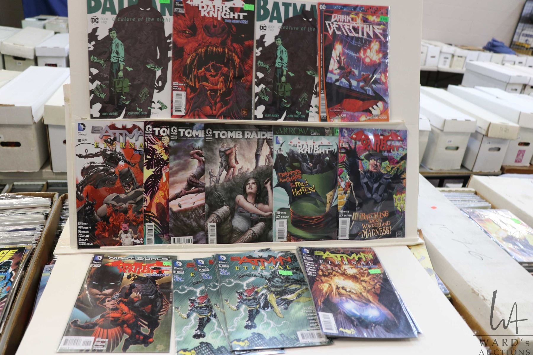 Box of approx. more than 300 comics including mostly all Batman, Batman the Dark Knight, Batman Eternal, etc. Important: Pickup is in Edmonton. Long comic boxes (28 x 8 x 11.5 and 23kg) will be shipped in 2 boxes approximately 11 x 9 x 12 and 13kg each through Canada Post. Long boxes can be palletized for large invoices. Details to follow