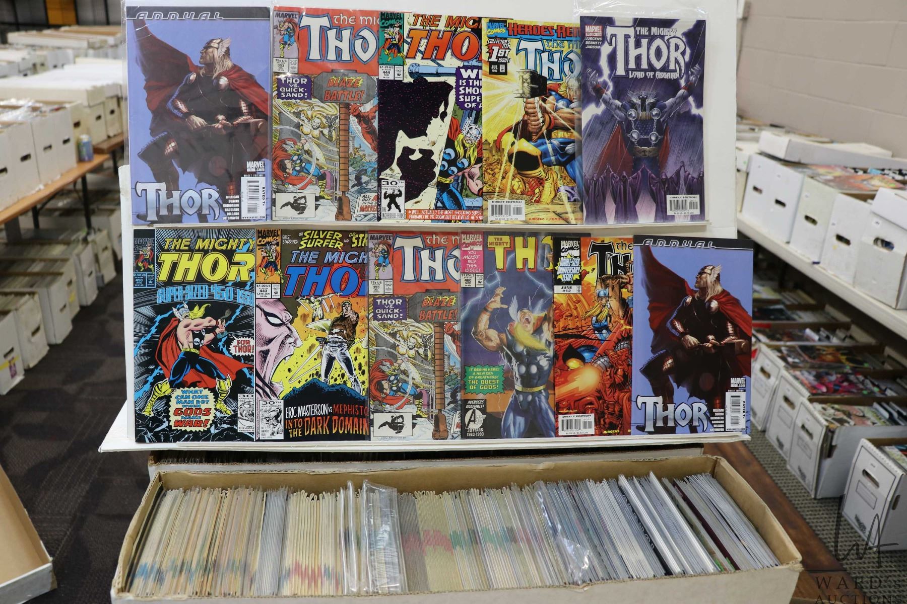 Box of approx. more than 300 comics including various Thor titles, etc. Important: Pickup is in Edmo