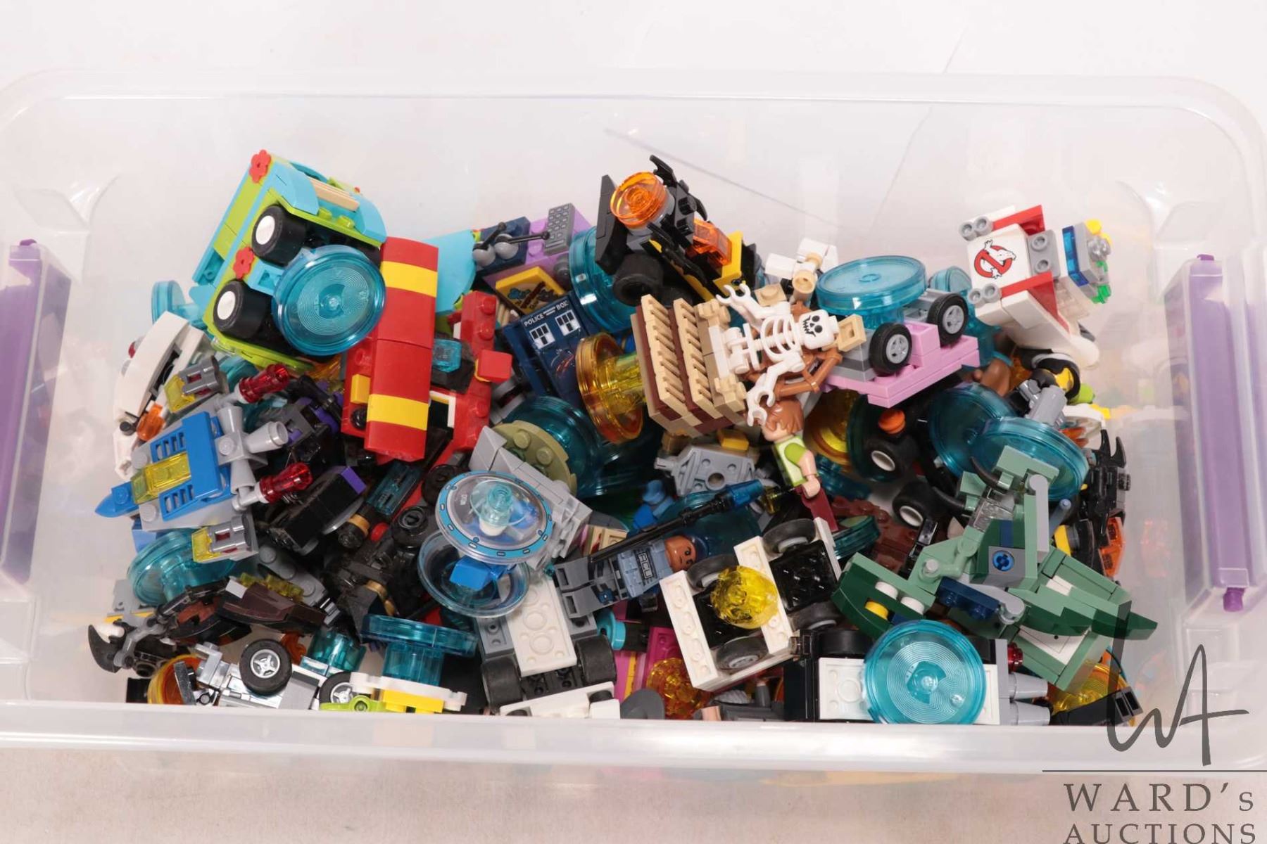 Box of assorted Lego building bricks and Minifigures includi Scooby Doo, Dinosaurs, vehicles etc. no