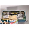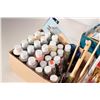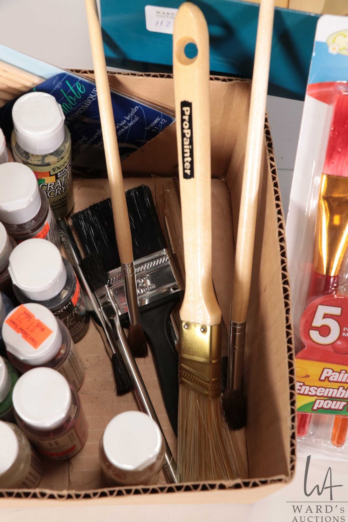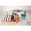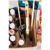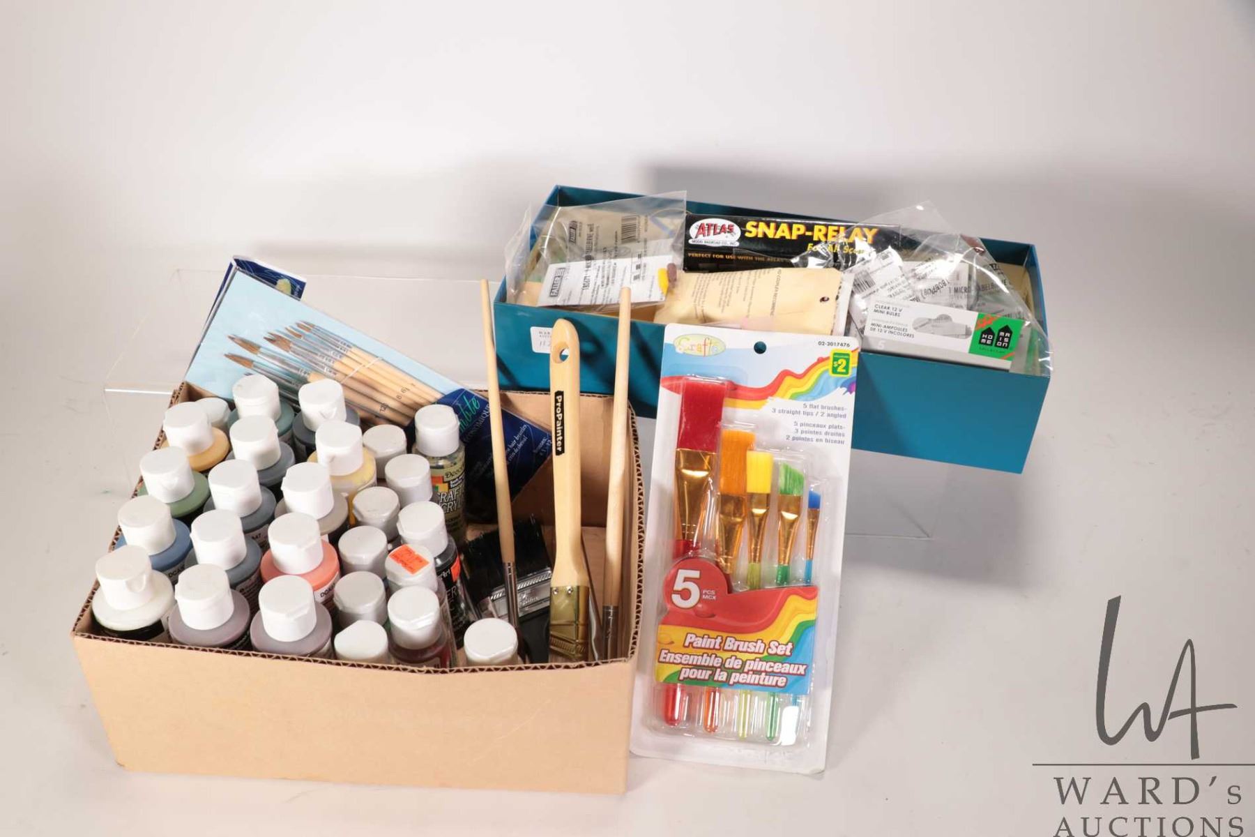 Box of electric lighting including bulbs on wire and a selection of acrylic paints and brushes