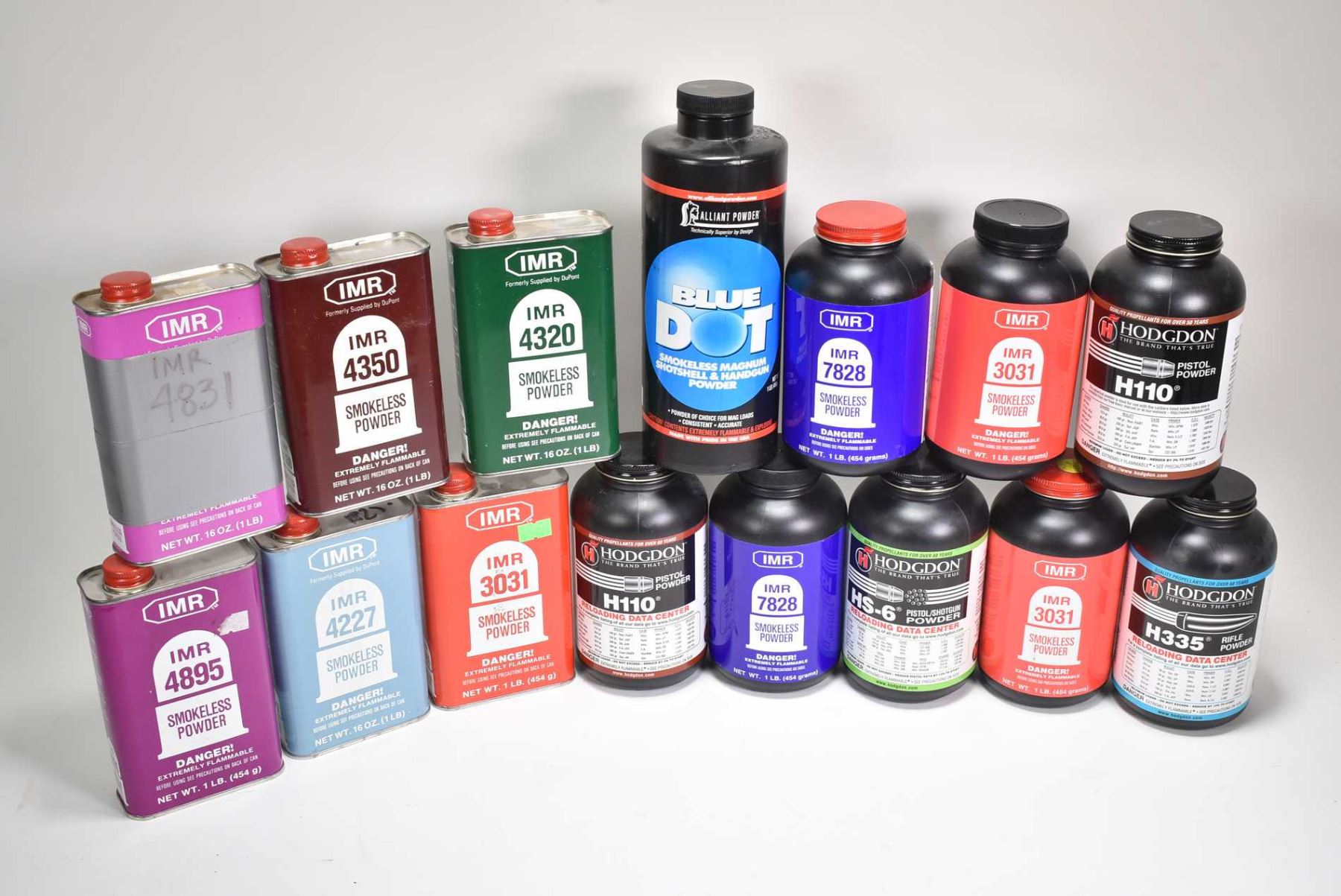Box of smokeless powder, mostly IMR. Twelve bottles full or nearly full.
