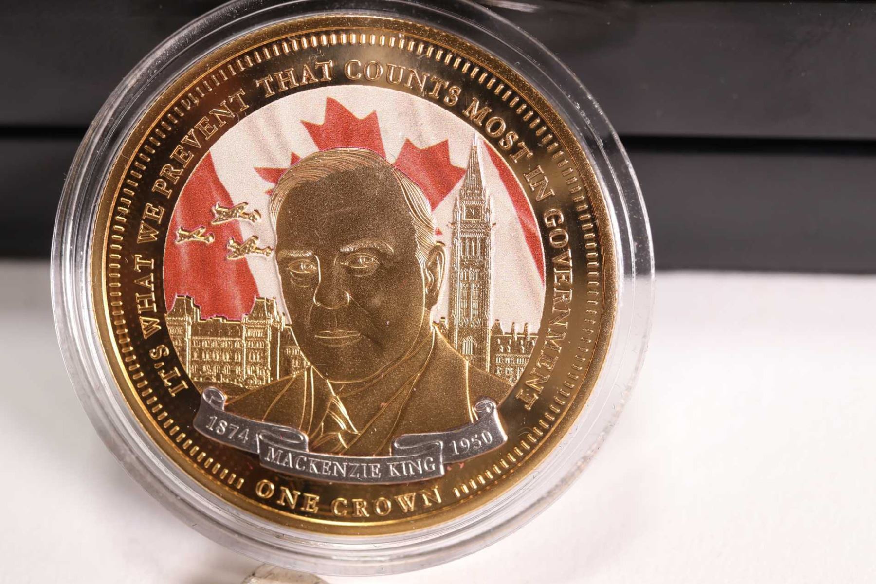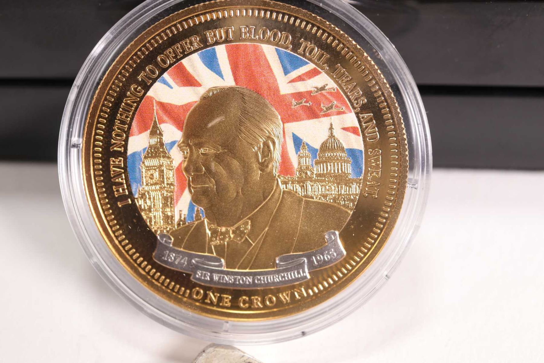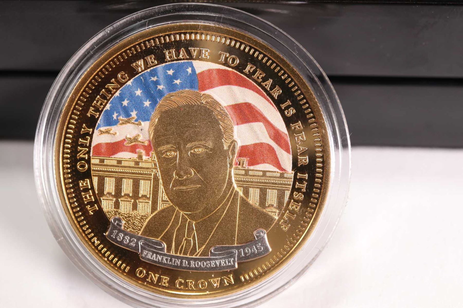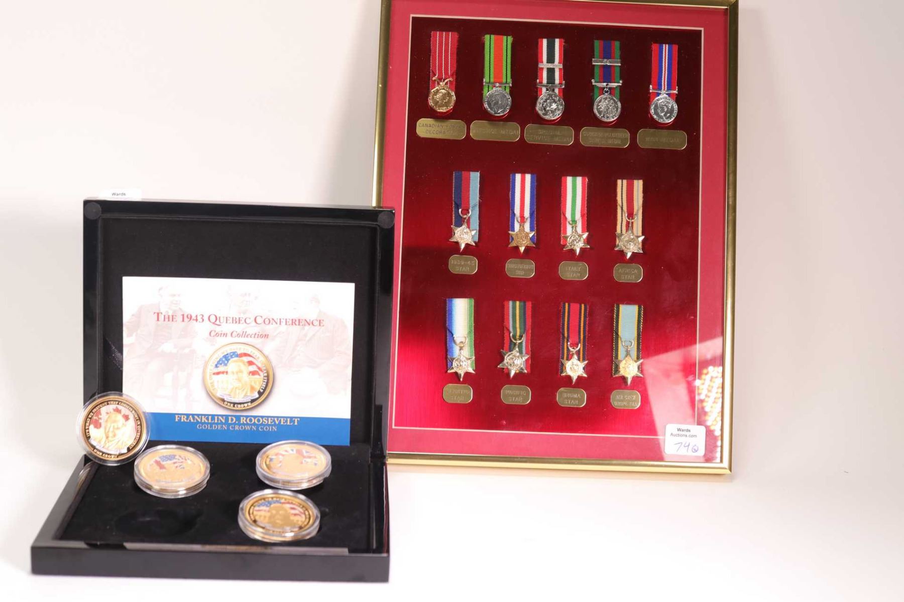 Boxed Branford Exchange Mint "The 1943 Quebec Conference- Franklin D. Roosevelt" golden crown collector coins set including four 24kt gold plated coins and a framed set of miniature military medals