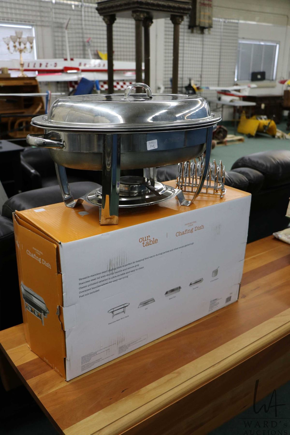 Boxed Our Table stainless steel 6 pce. 9 1/2 quart chafing dish and an oval Sunnex chafing dish with spirit burner and two toast racks