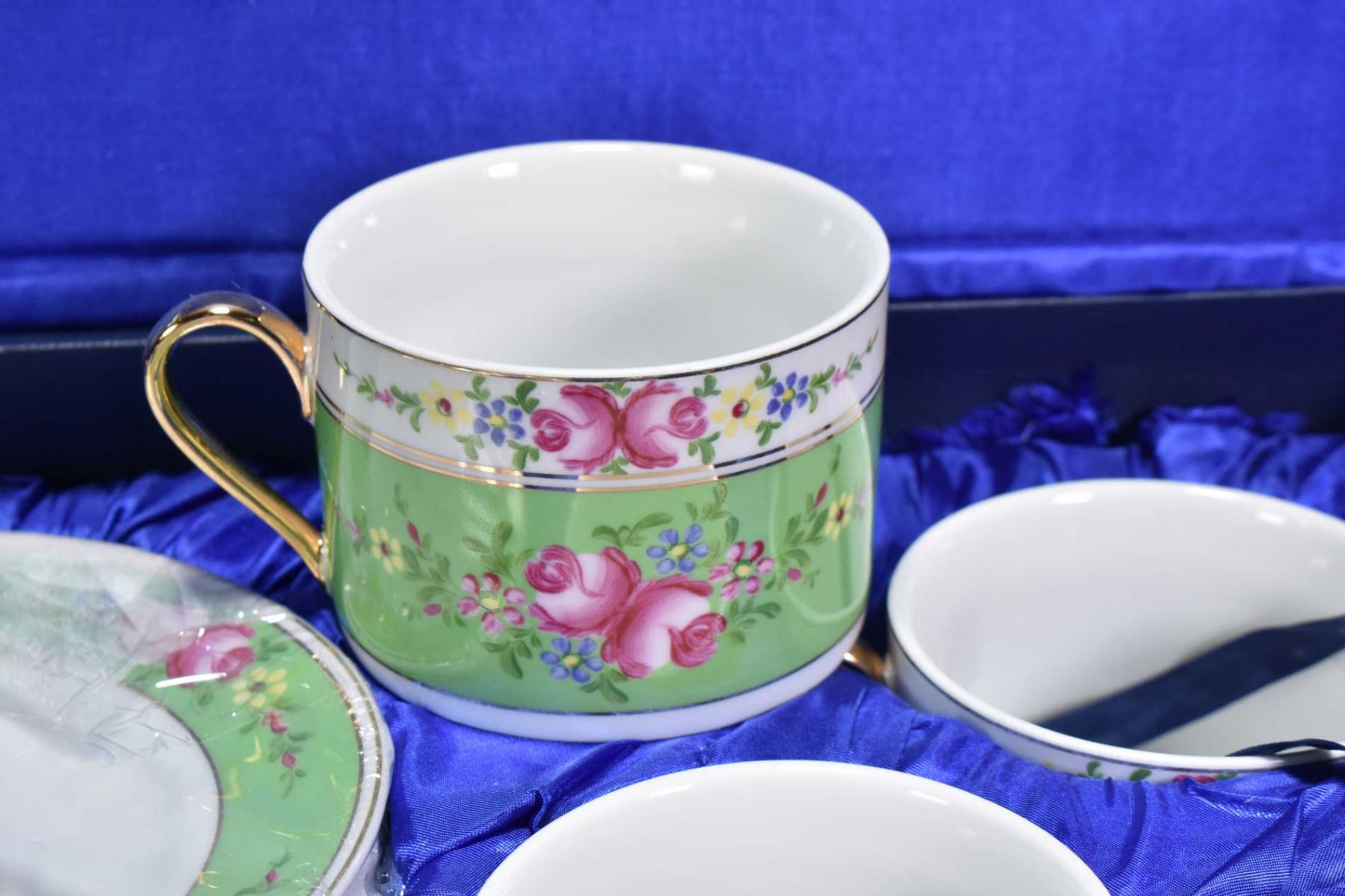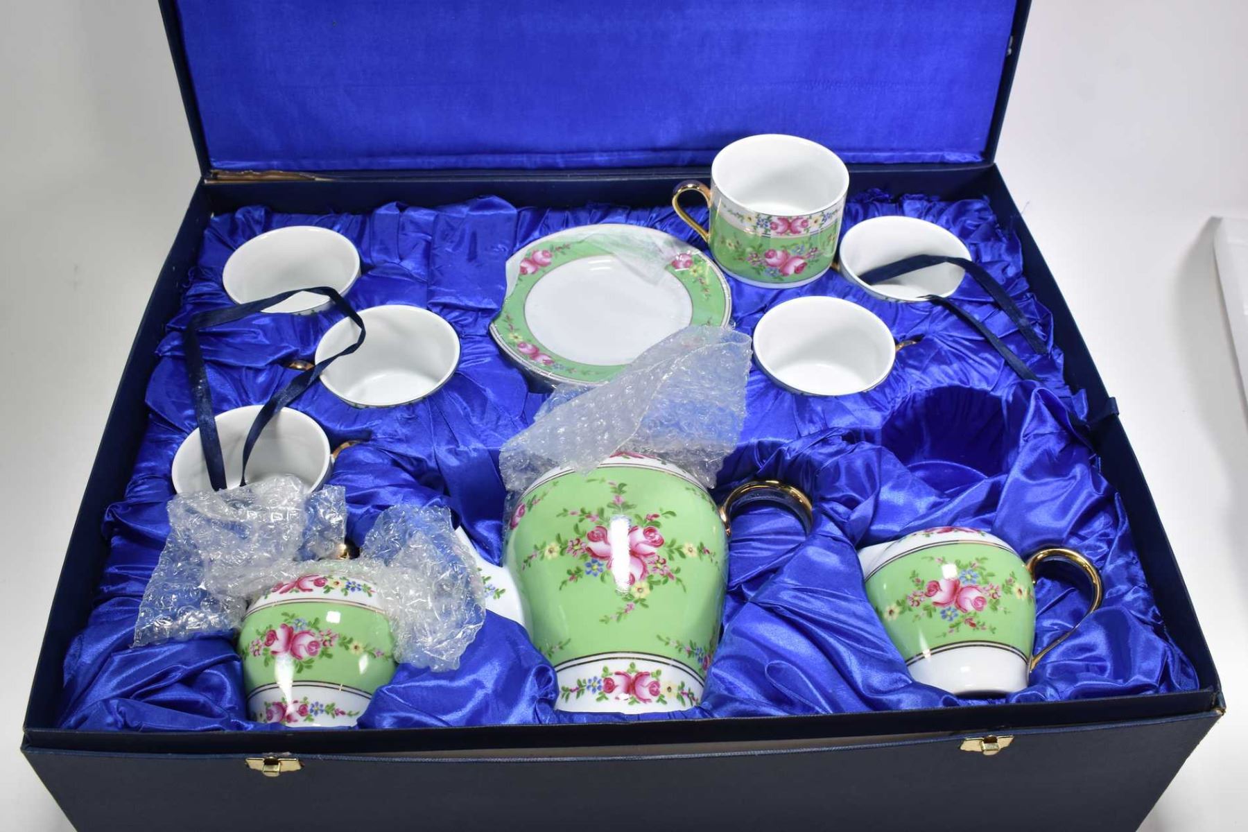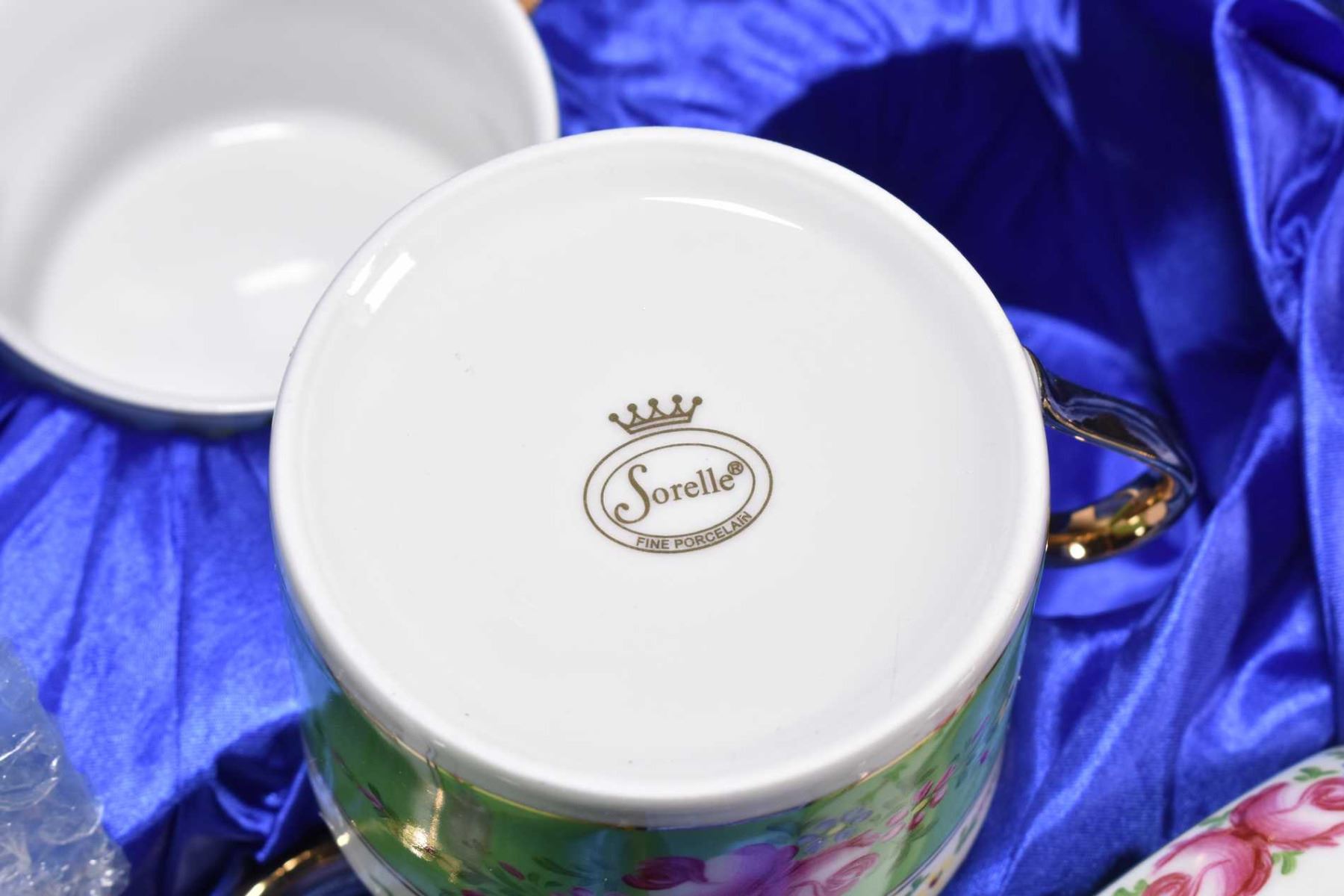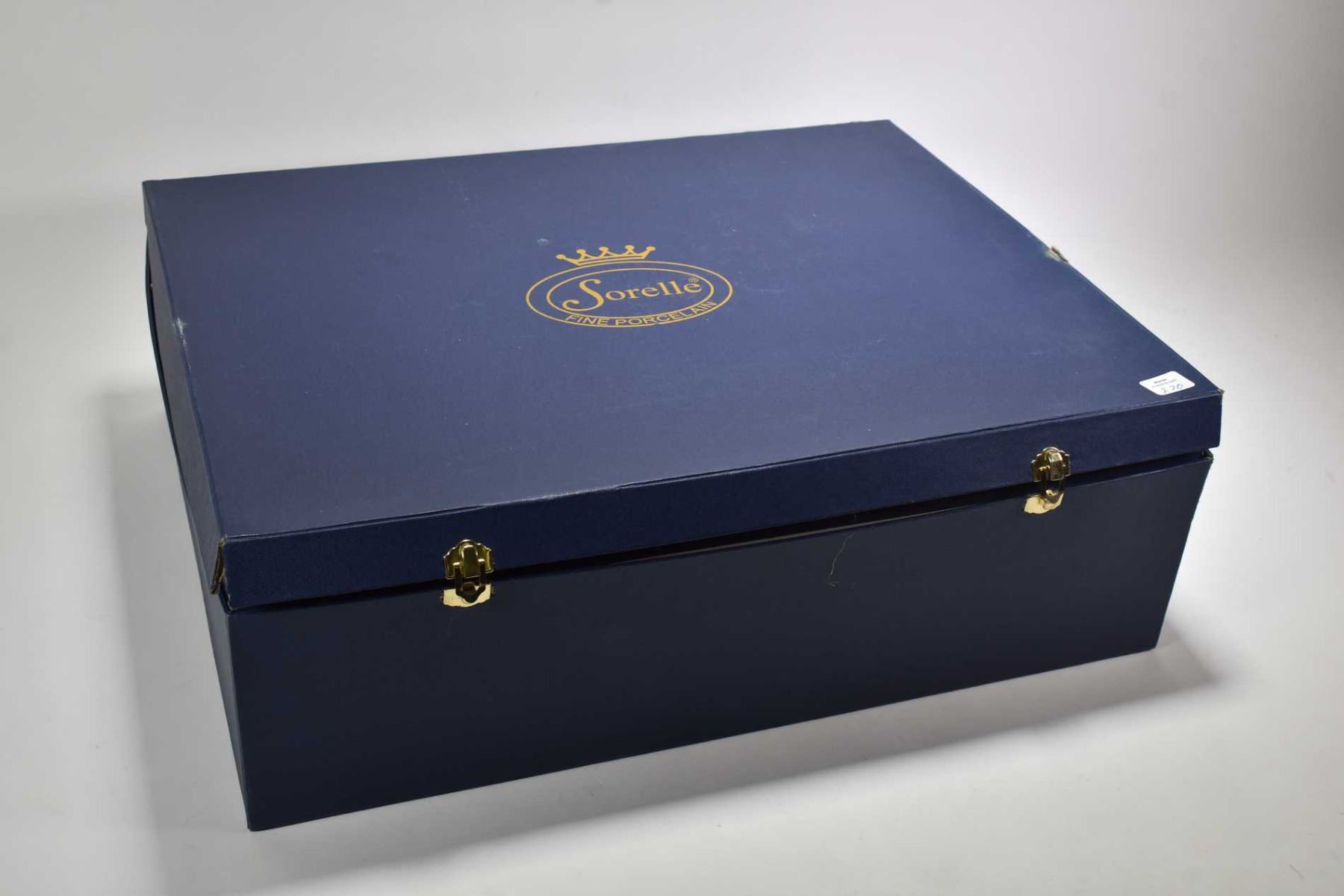 Boxed Sorelle Fine Porcelain tea service including tea pot, cream jug and lidded sugar with six cups and saucers