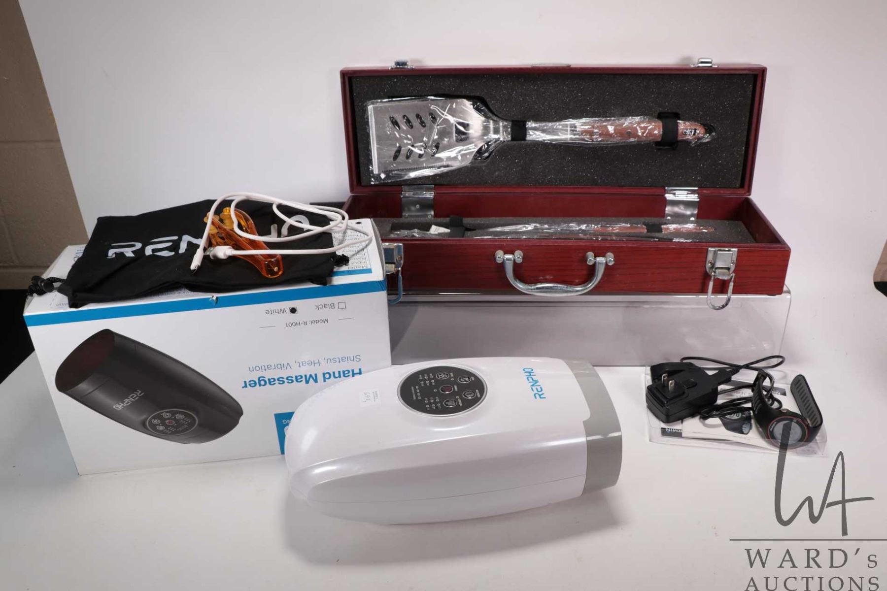 Boxed barbeque tool set, Garmin "Approach S-3" golfing watch with charger, working at time of cataloguing and a Renpho chargeable hand massager model no. R-H001, working at time of cataloguing