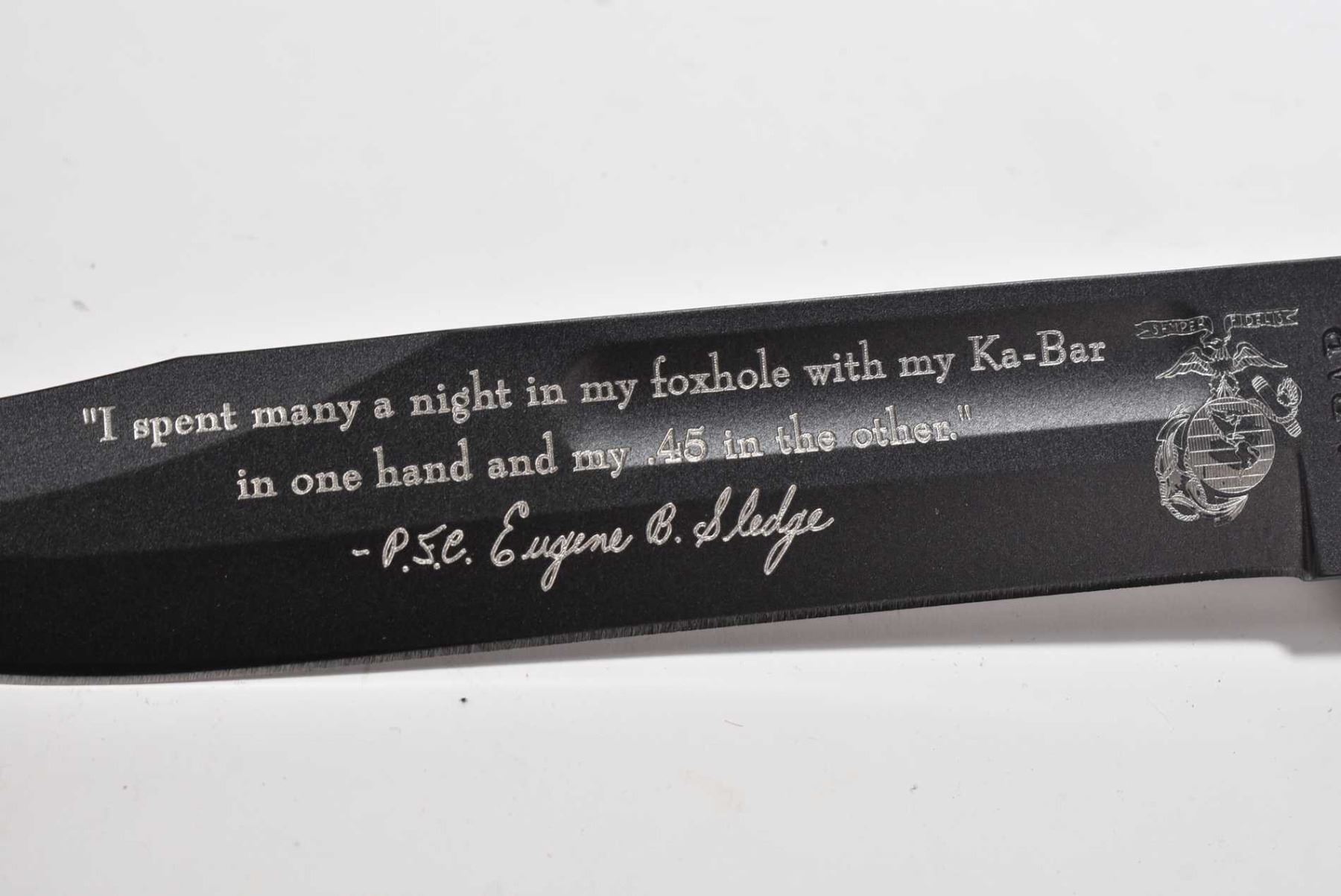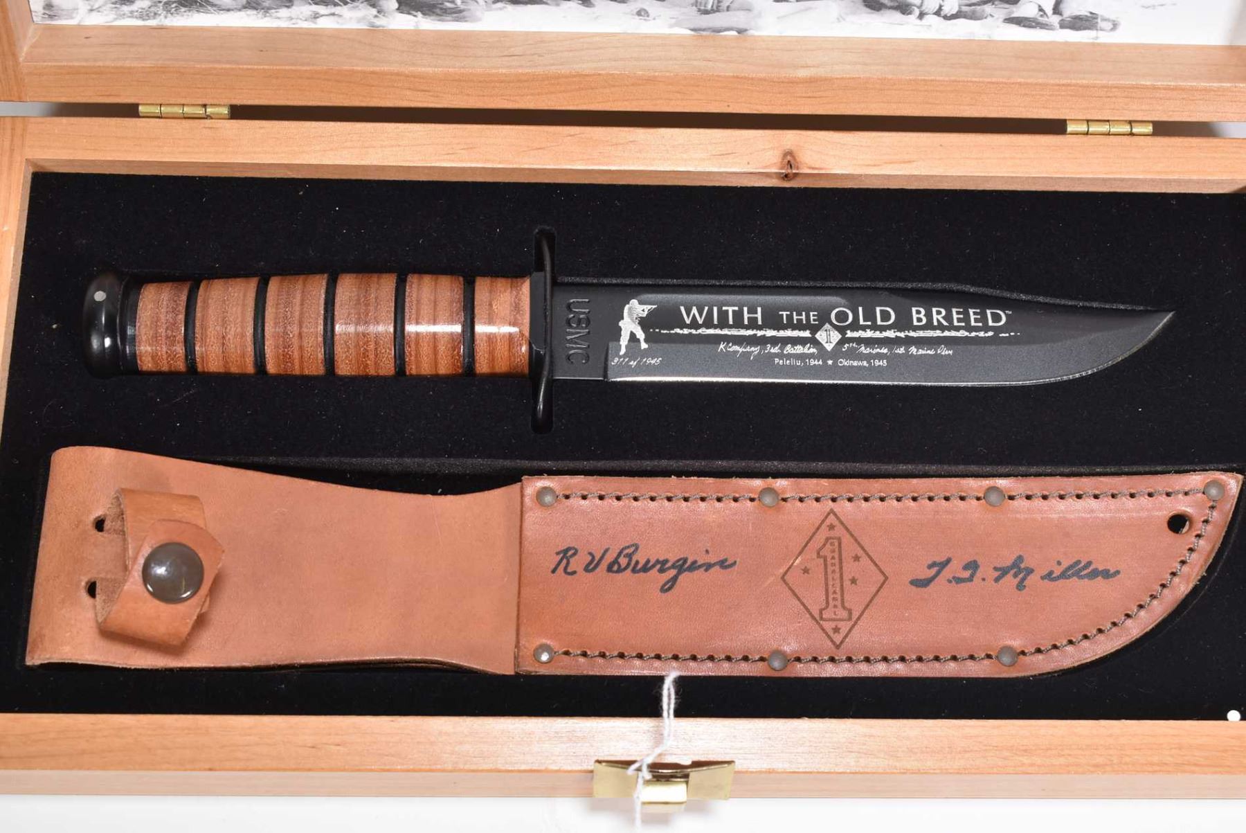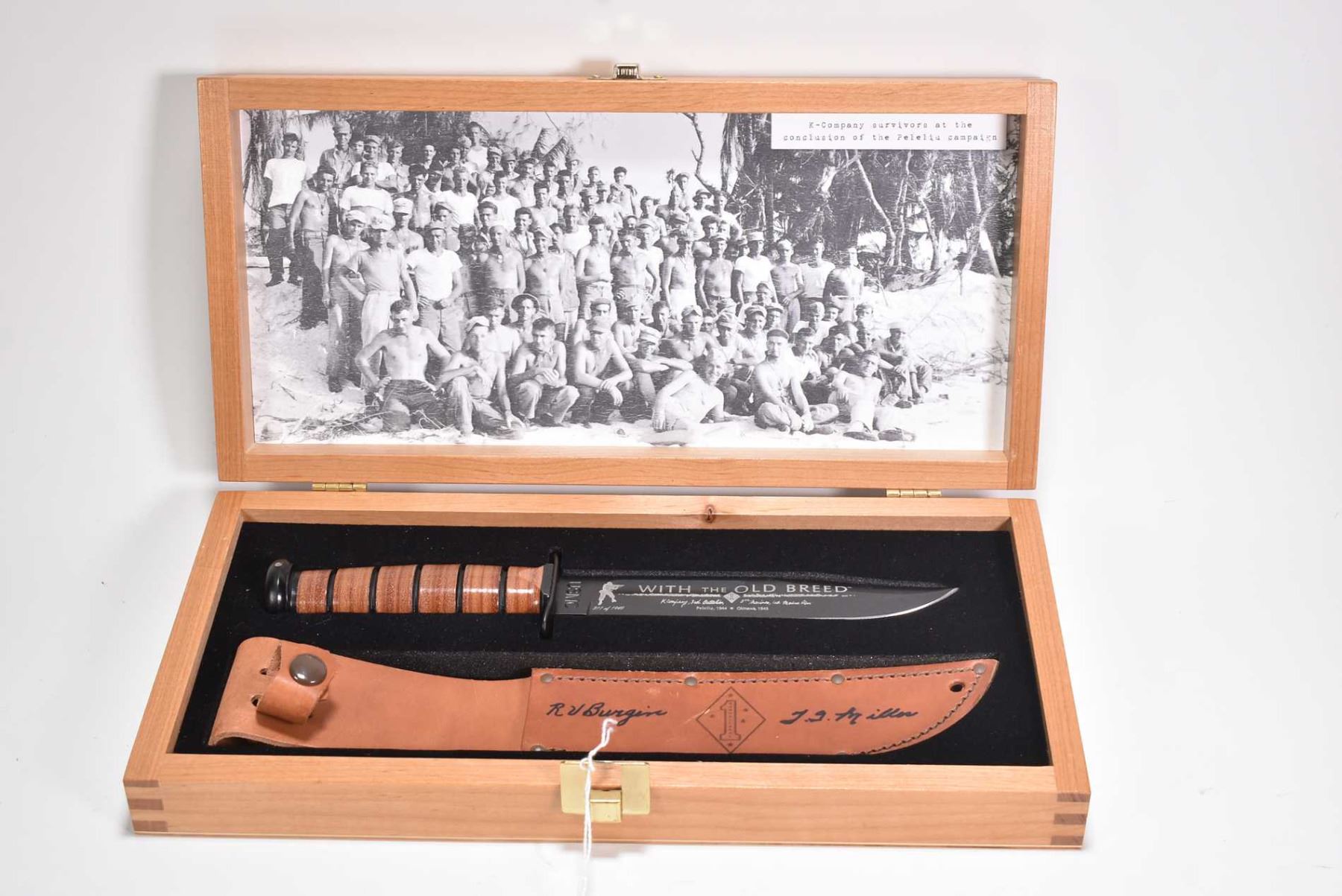 Boxed commemorative Ka-bar knife "With The Old Breed" limited edition 311/1945 inscribed "I spent many a night in my fox hole with my Ka-bar in one hand and my .45 in the other "signed P.S.E. Eugene B. Sledge and the other side engraved with soldier figure "K-Company, 3rd battalion, 5th marines, 1st Marine Division". plus leather scabbard hand signed by R.V. Bergin (Squad leader for Eugene Sledge) and T.I. Miller (Old Breed Gunnery Sargent)