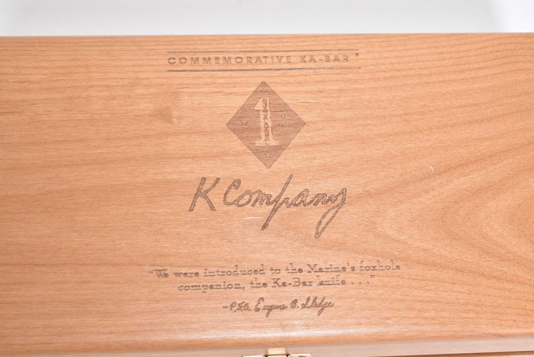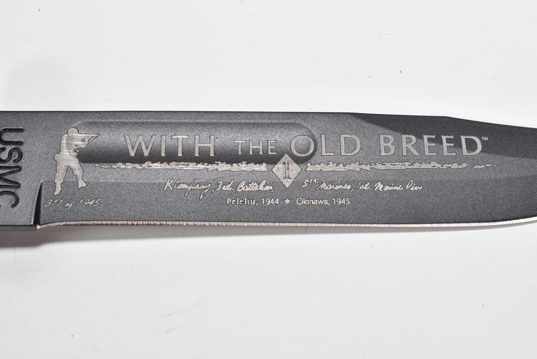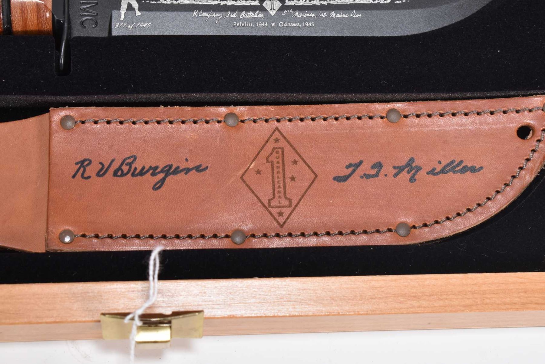 Boxed commemorative Ka-bar knife "With The Old Breed" limited edition 311/1945 inscribed "I spent many a night in my fox hole with my Ka-bar in one hand and my .45 in the other "signed P.S.E. Eugene B. Sledge and the other side engraved with soldier figure "K-Company, 3rd battalion, 5th marines, 1st Marine Division". plus leather scabbard hand signed by R.V. Bergin (Squad leader for Eugene Sledge) and T.I. Miller (Old Breed Gunnery Sargent)