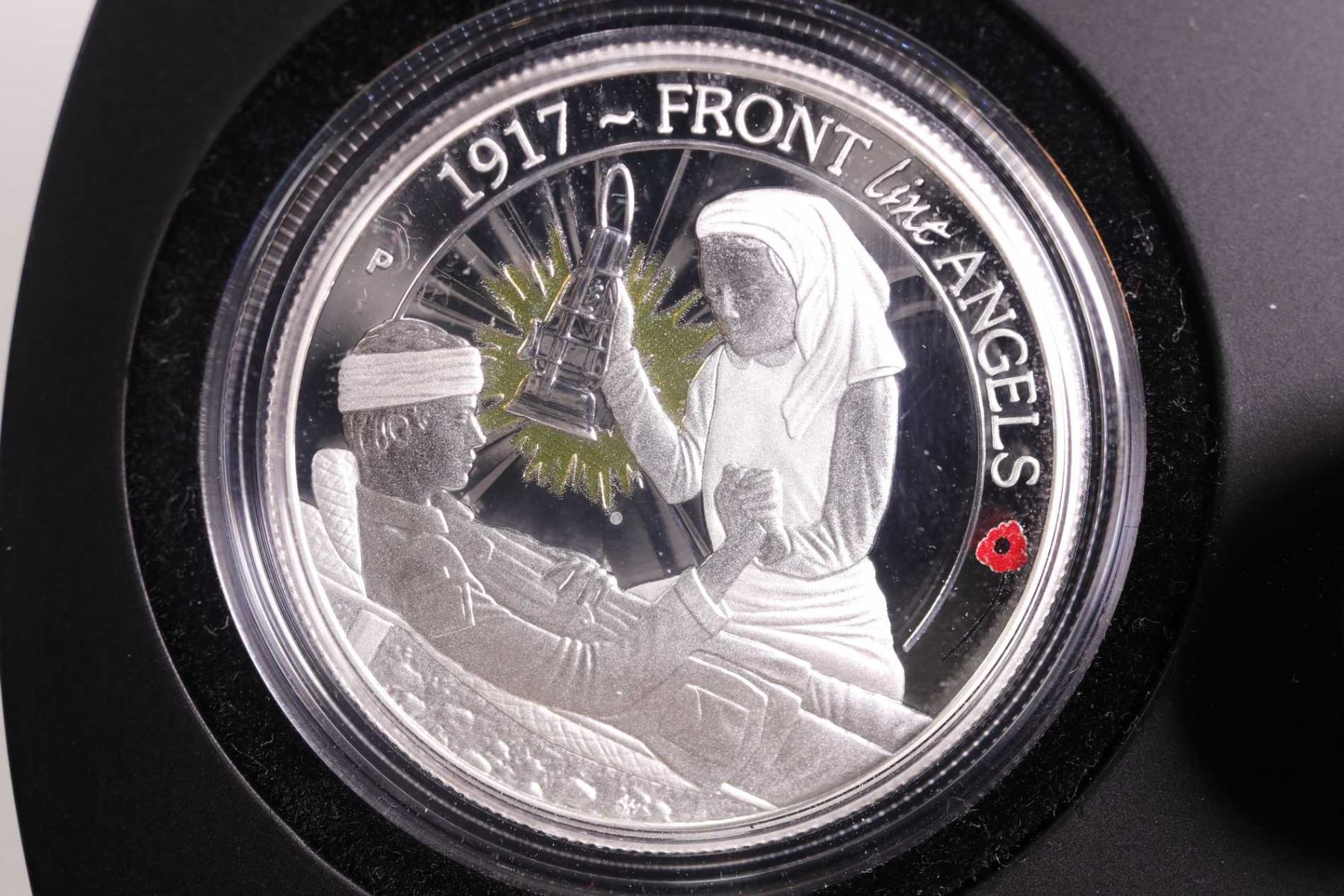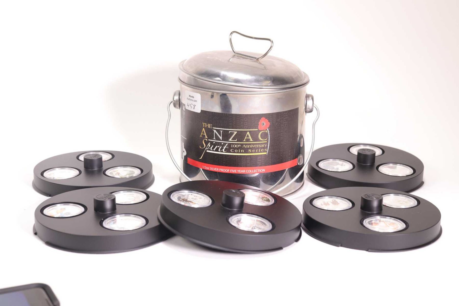 Boxed complete set of The Perth Mint of Australia 2016 "The Anzac Spirit 100th Anniversary Coin Series" including all fifteen 1/2 ounce 99.99% pure silver coins in a metal Billy can. Note each three coin section originally retailing for $208.79 CAD, total for complete set $1000.00+