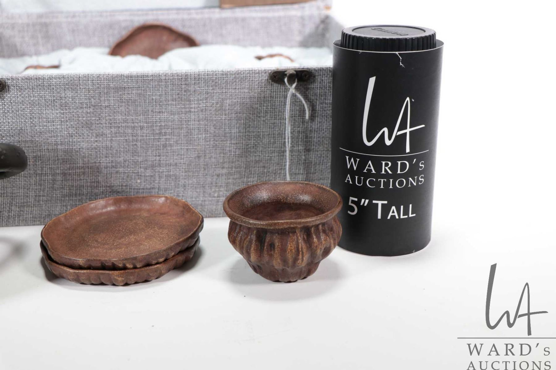 Boxed purple clay "Lotus and Seeds" teapot set in case with documents, stamped Ku Ching-Chou