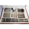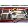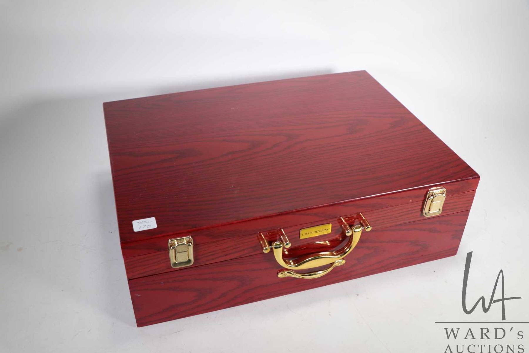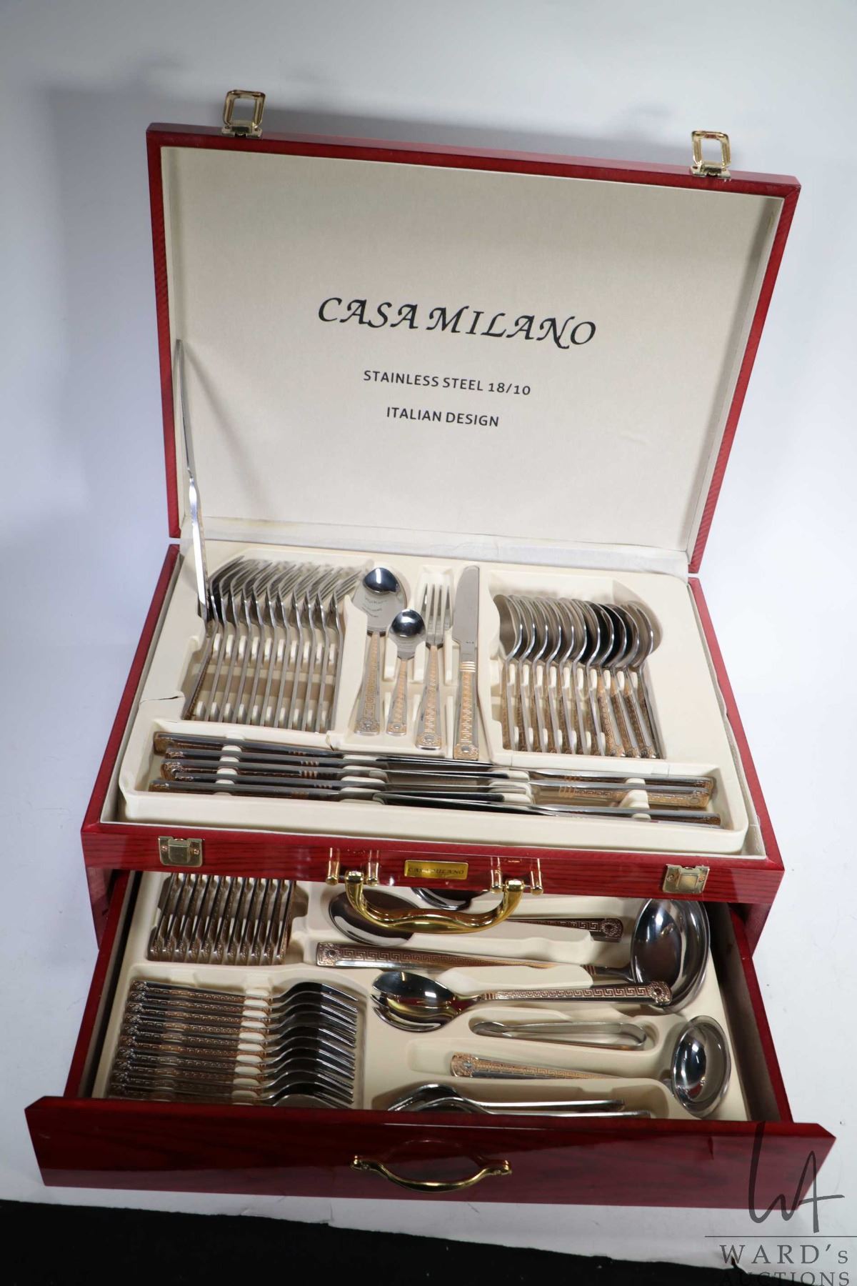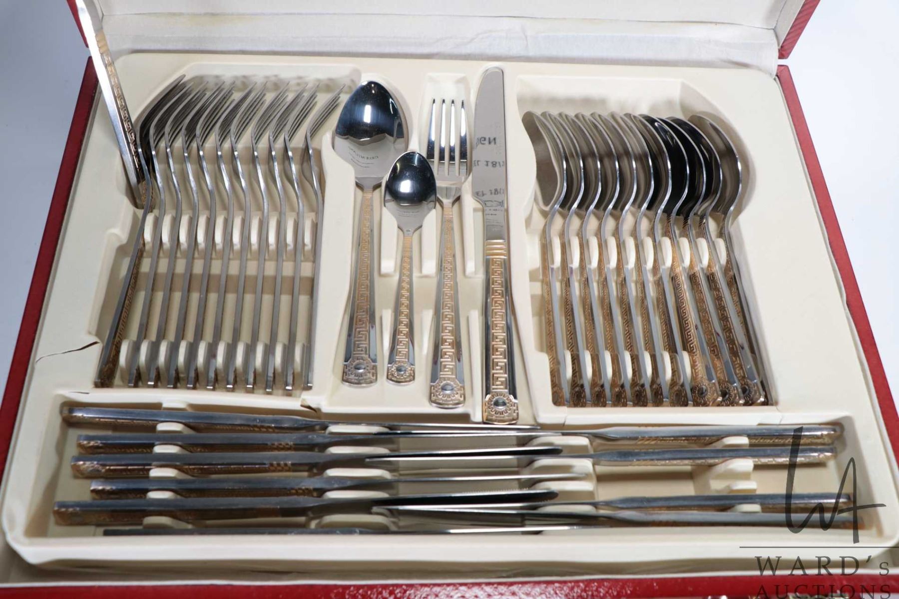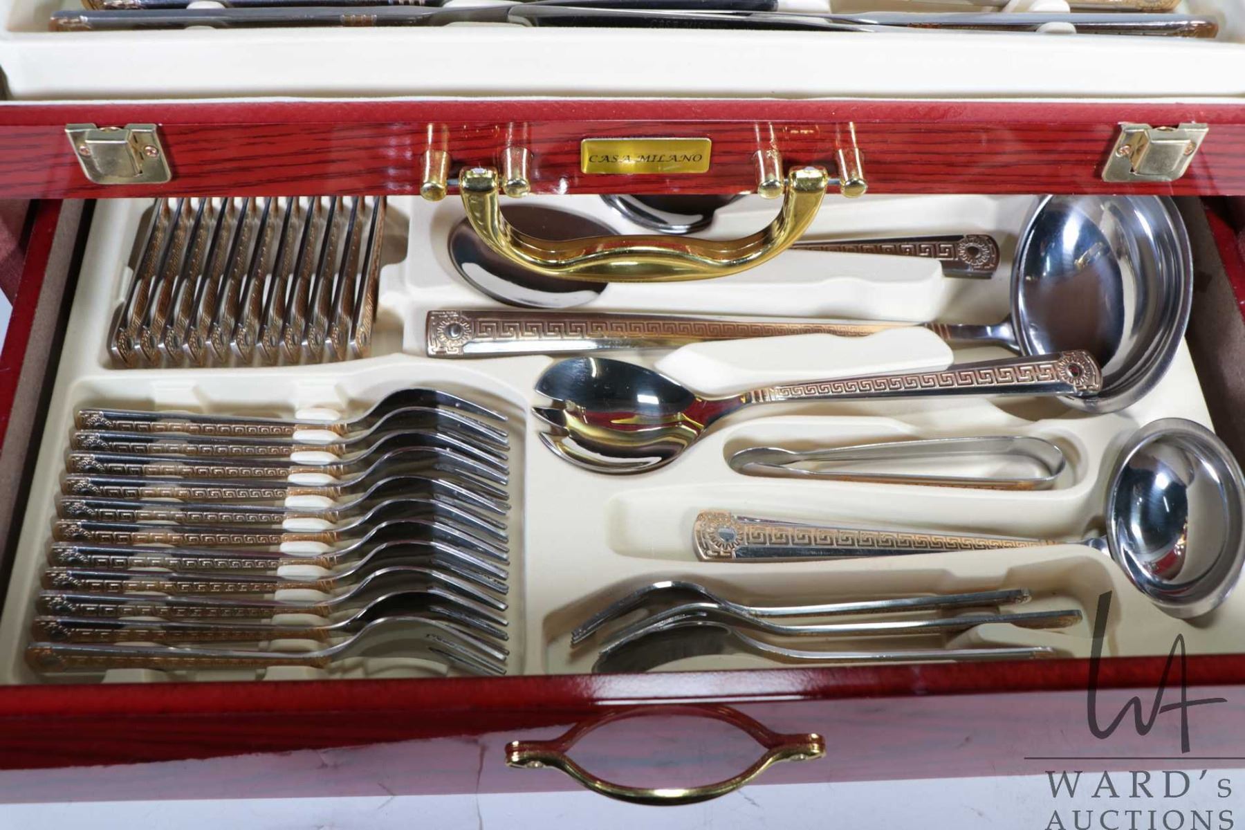 Boxed set of Casa Milano Italian style, Greek Key design, stainless steel flatware including settings for twelve plus serving pieces, appears complete