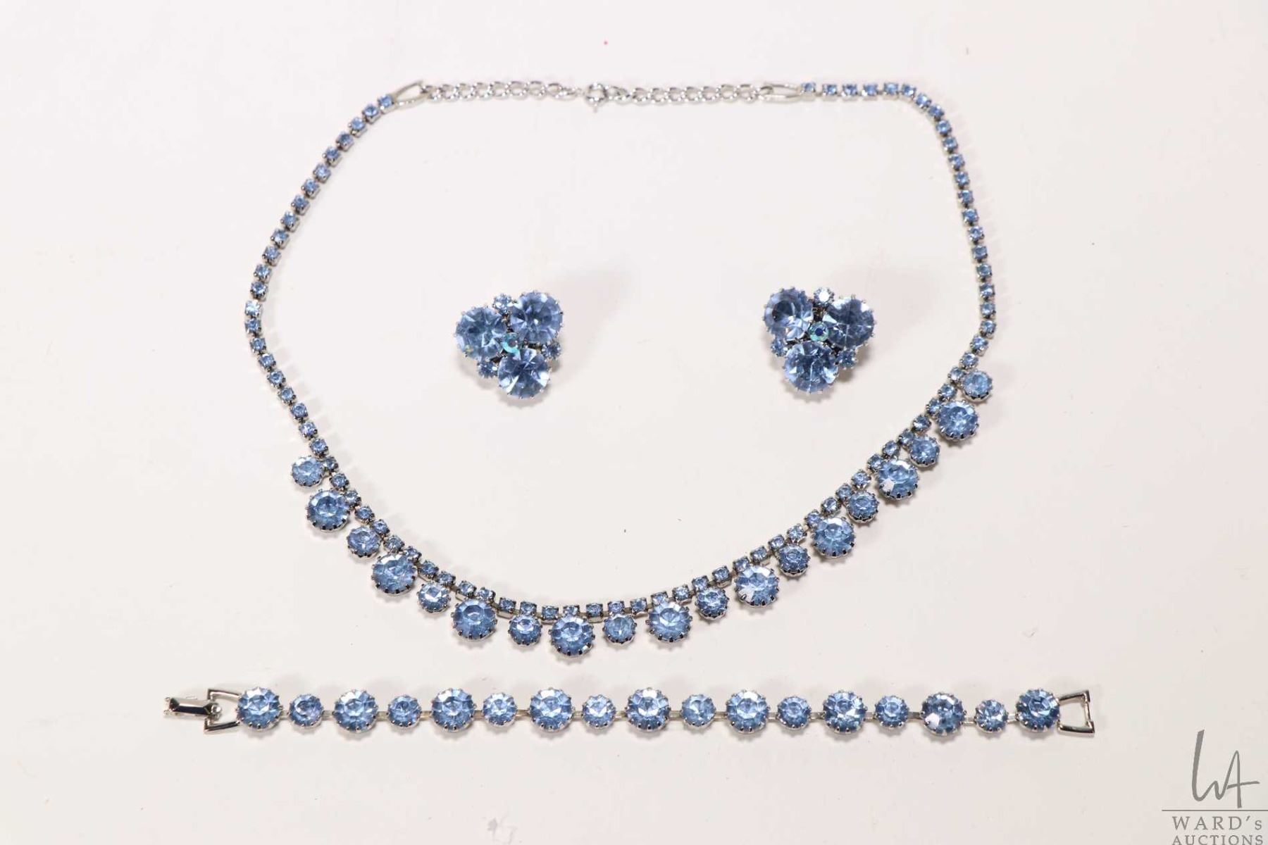 Boxed suite of signed Weiss crystal gemstone like jewellery including necklace, matching earrings and bracelet, note in original Albert Weiss jewel case