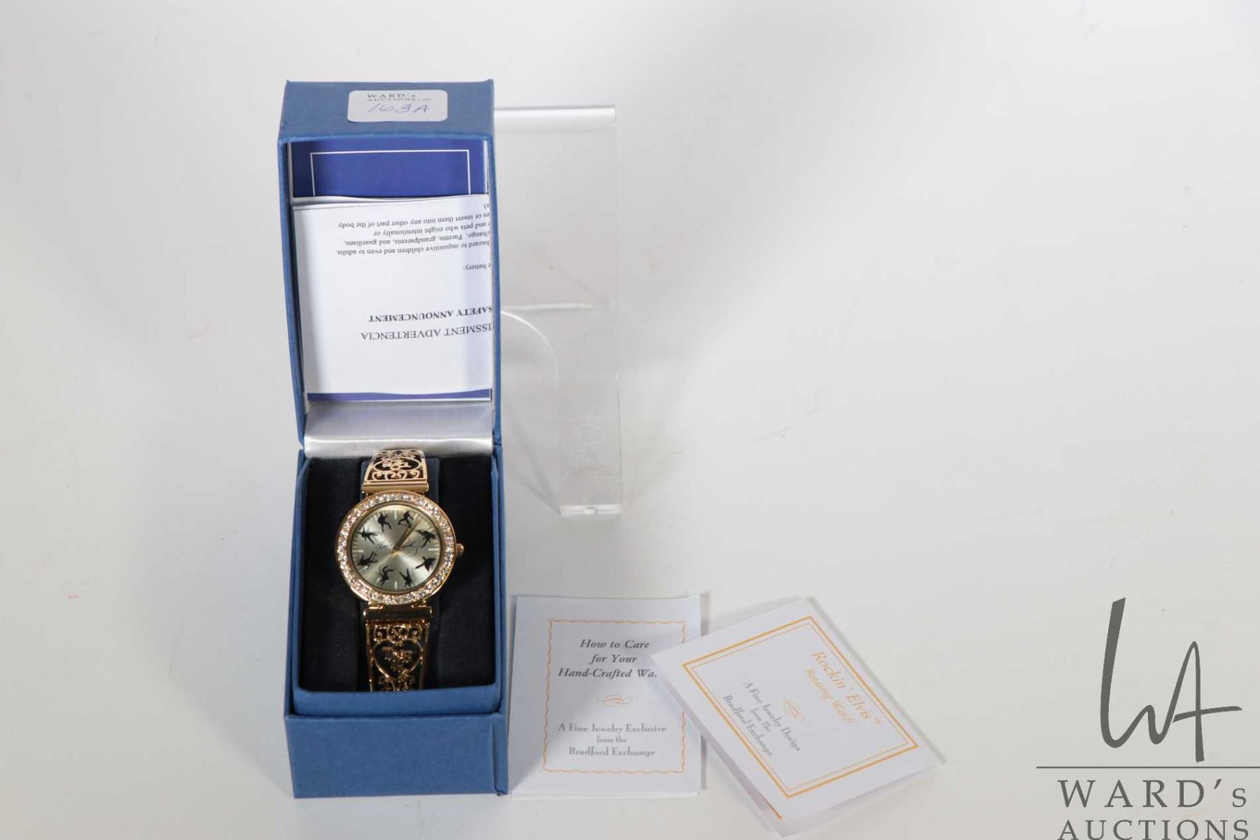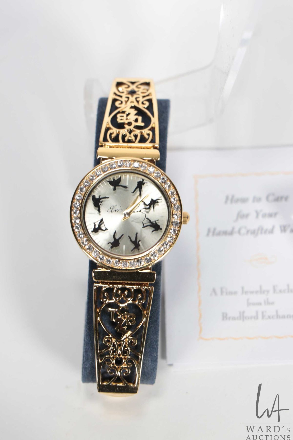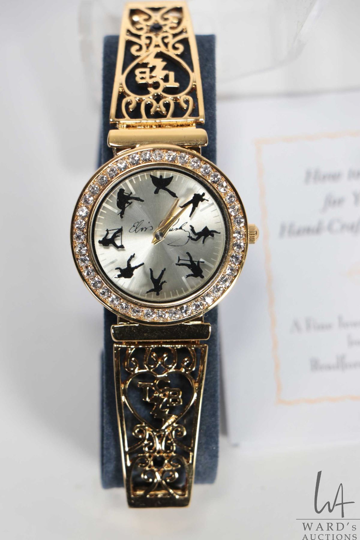 Bradford Exchange "Rockin Elvis" rotating wrist watch with crystal set bezel and original packaging, appears new or near new, includes original box and paperwork, working at time of cataloguing