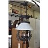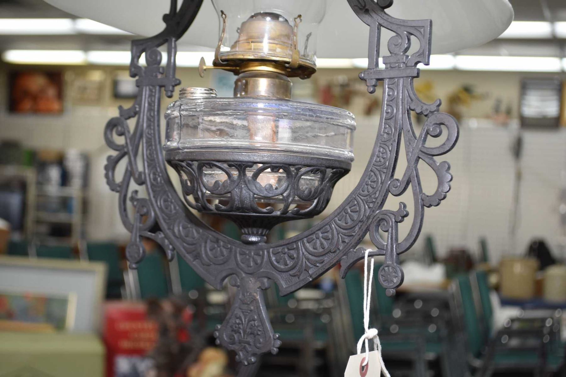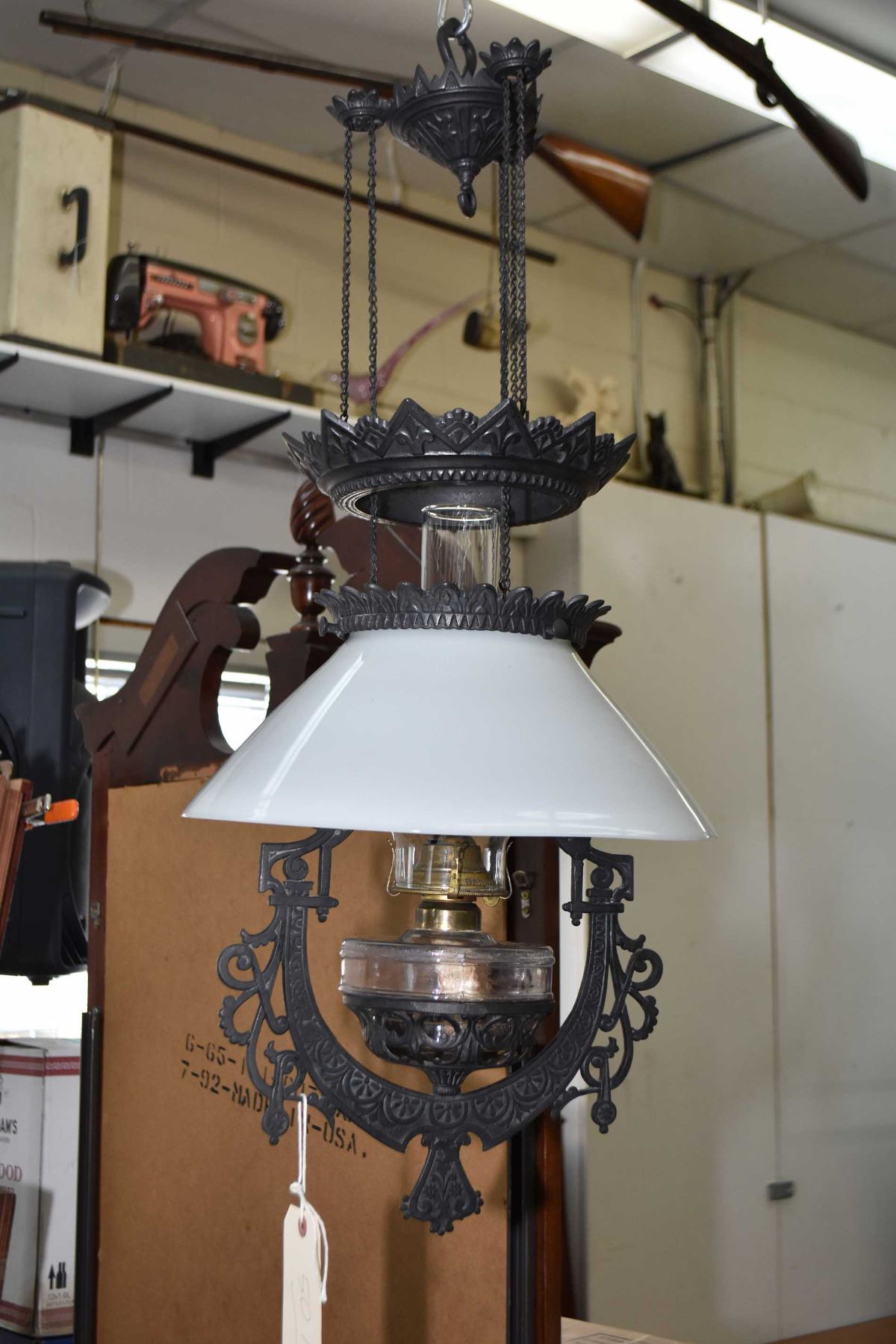 Bradley and Hubbard decorative cast frame and mount hanging kerosene light fixture, milk glass shades and working counter weight