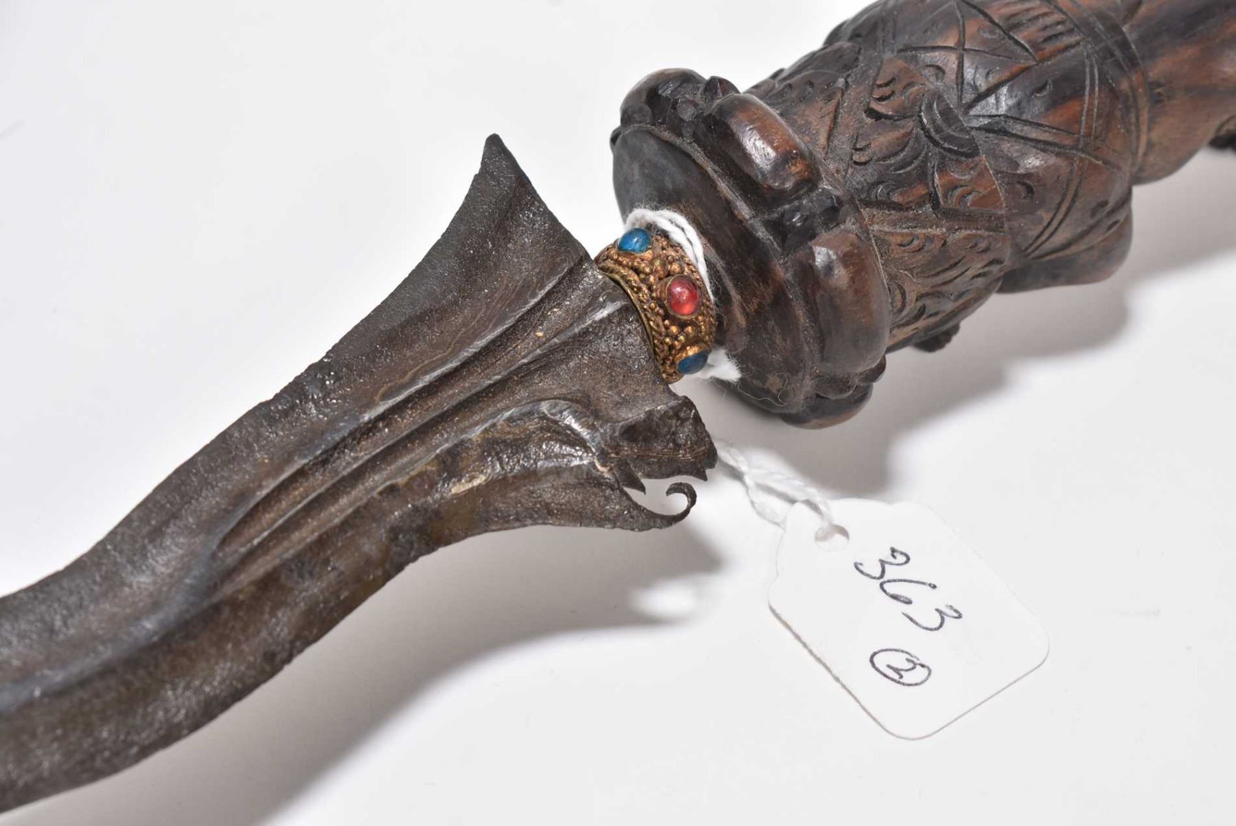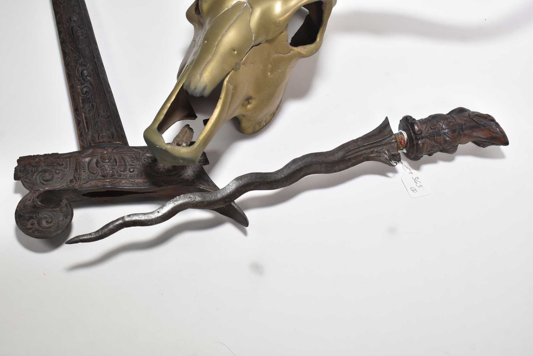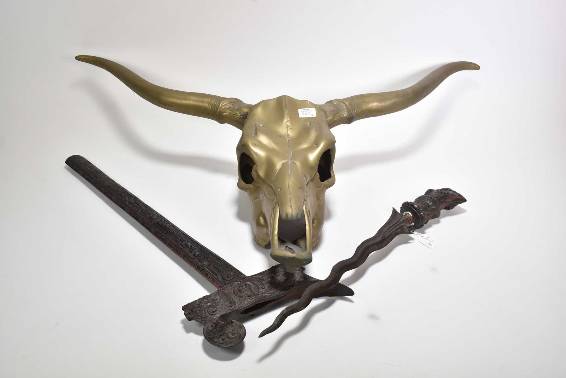 Brass Texas longhorn skull 27" in width, and an Indonesian knife with heavily carved wooden handle and sheath