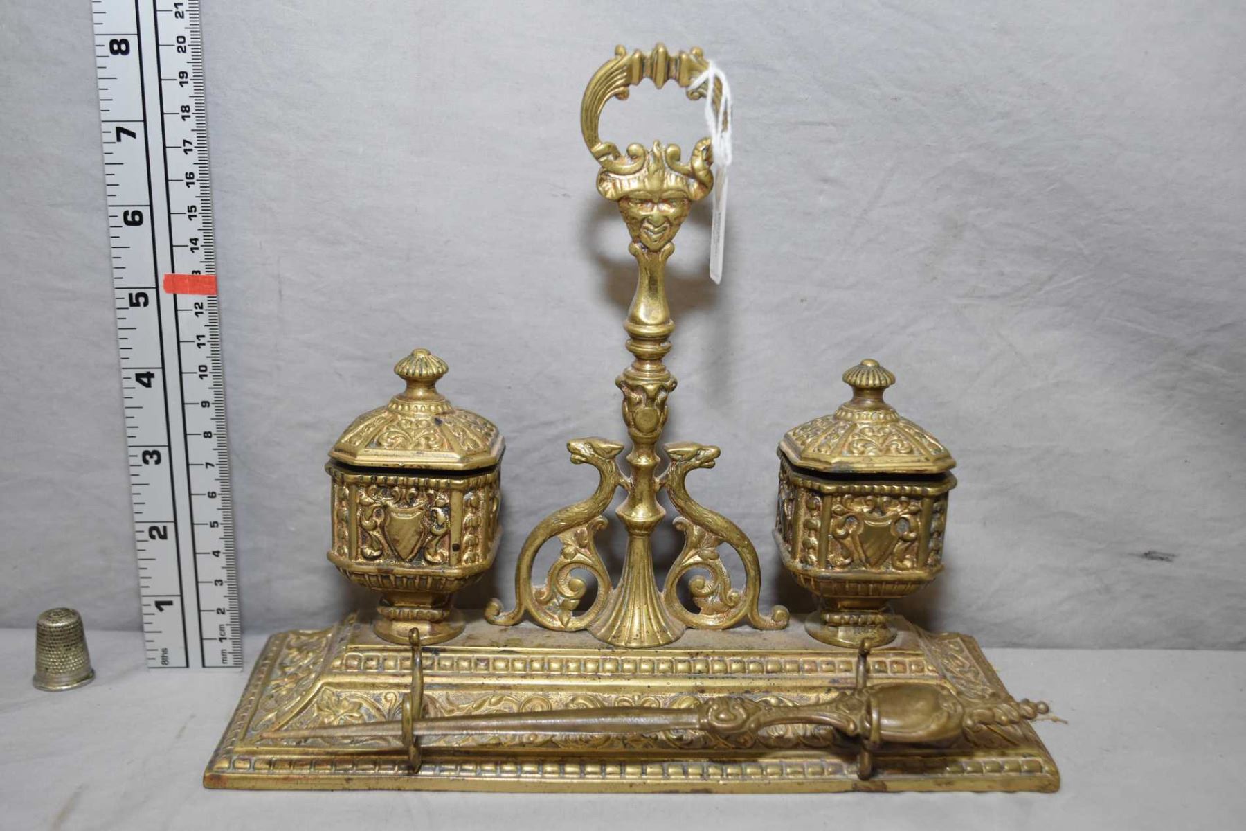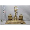 Brass double lidded inkwells with liners, pen holder and letter opener
