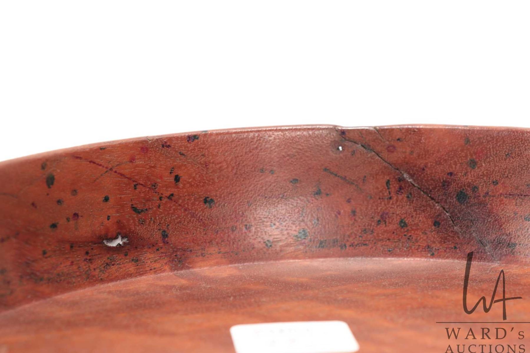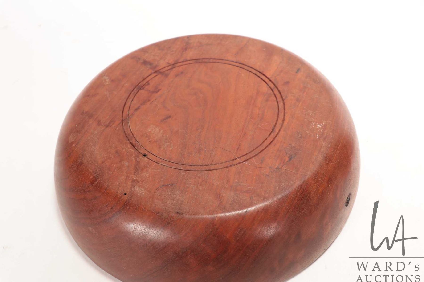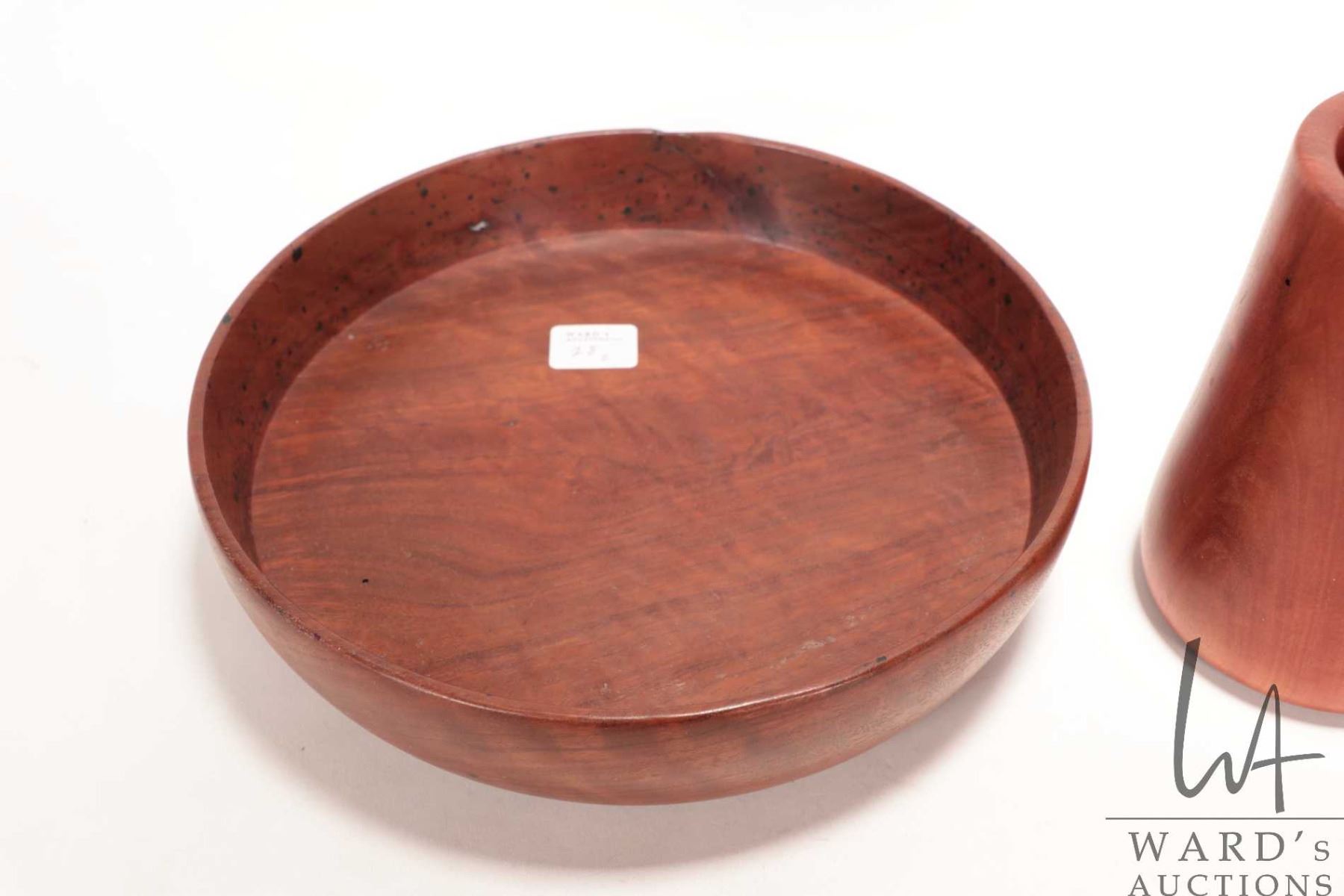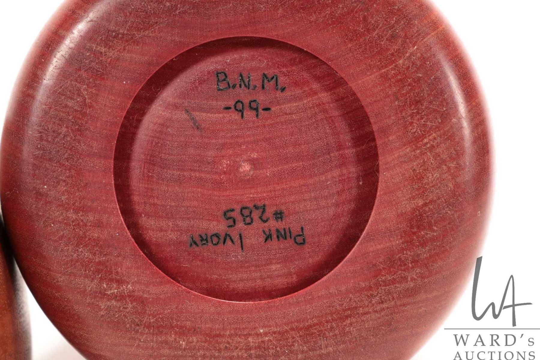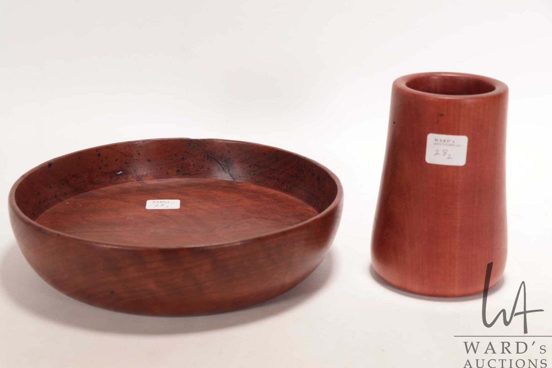 Brian McEvoy, artisan made decorative Pink Ivory turned wooden 5 1/2" high vase. Initialed by artist, numbered 285 and dated 99 plus unmarked turned wooden bowl, 9" in diameter and 2 1/2" in height