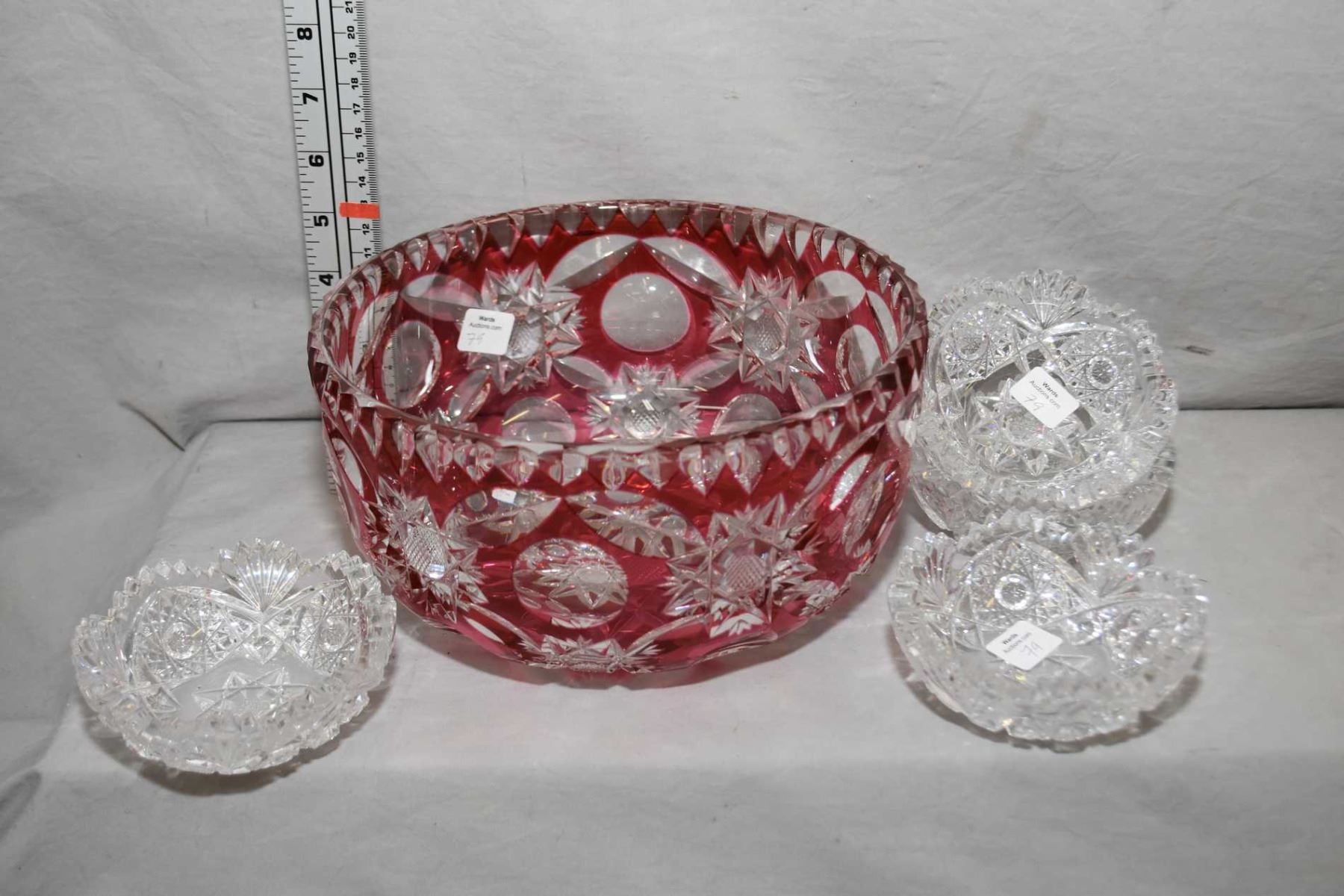 Brilliant ruby cut to clear hobstar trifle bowl with five hobstar nappies