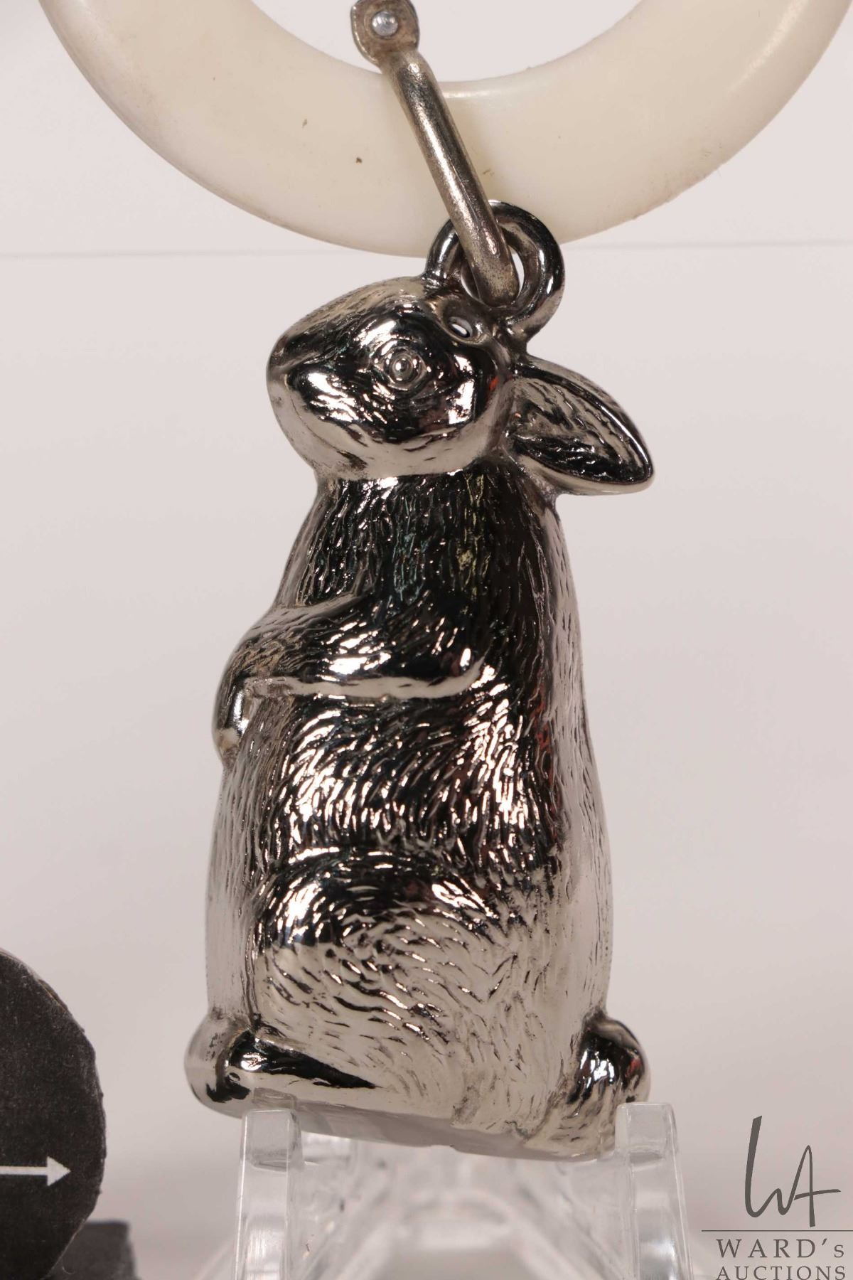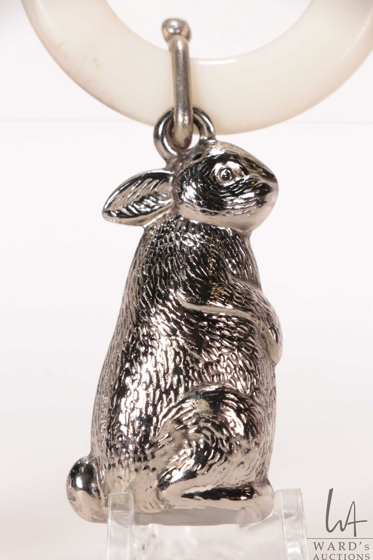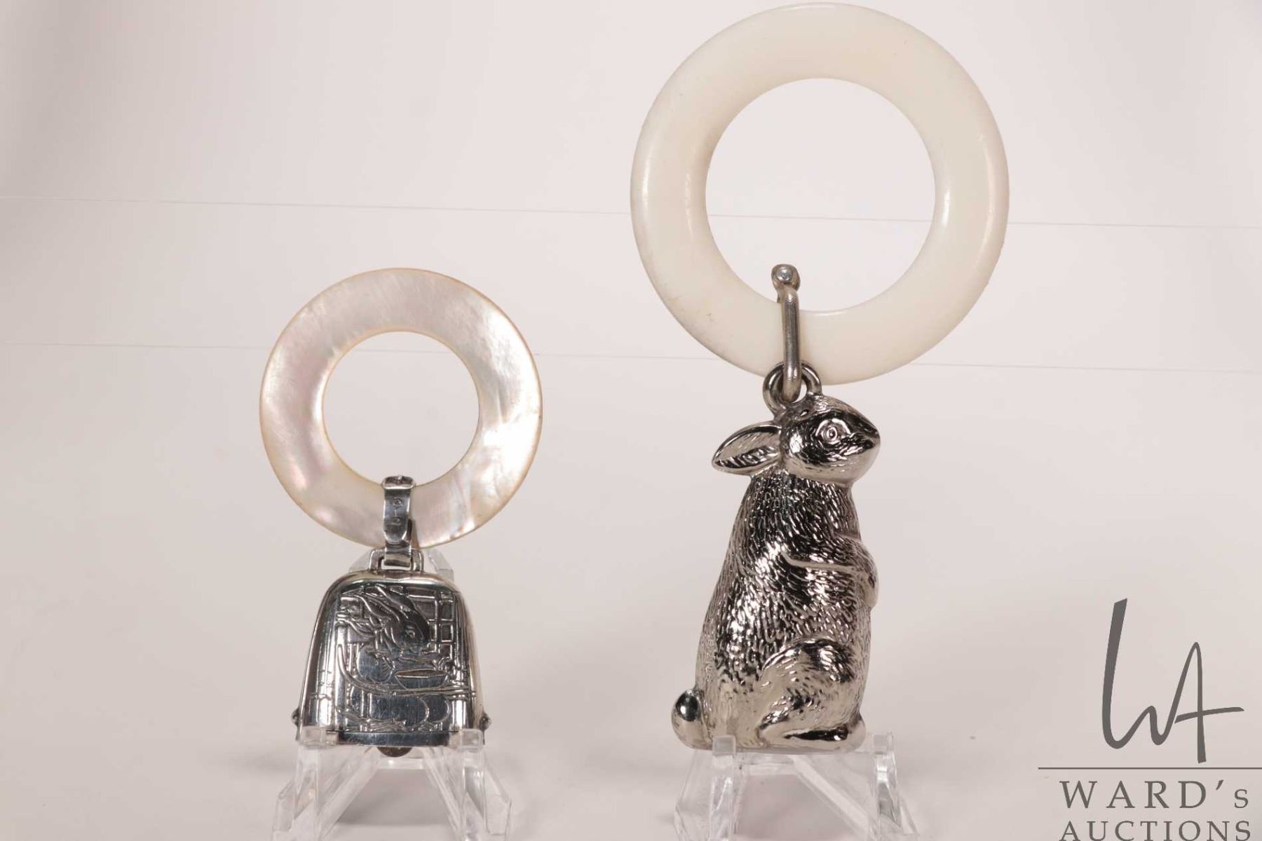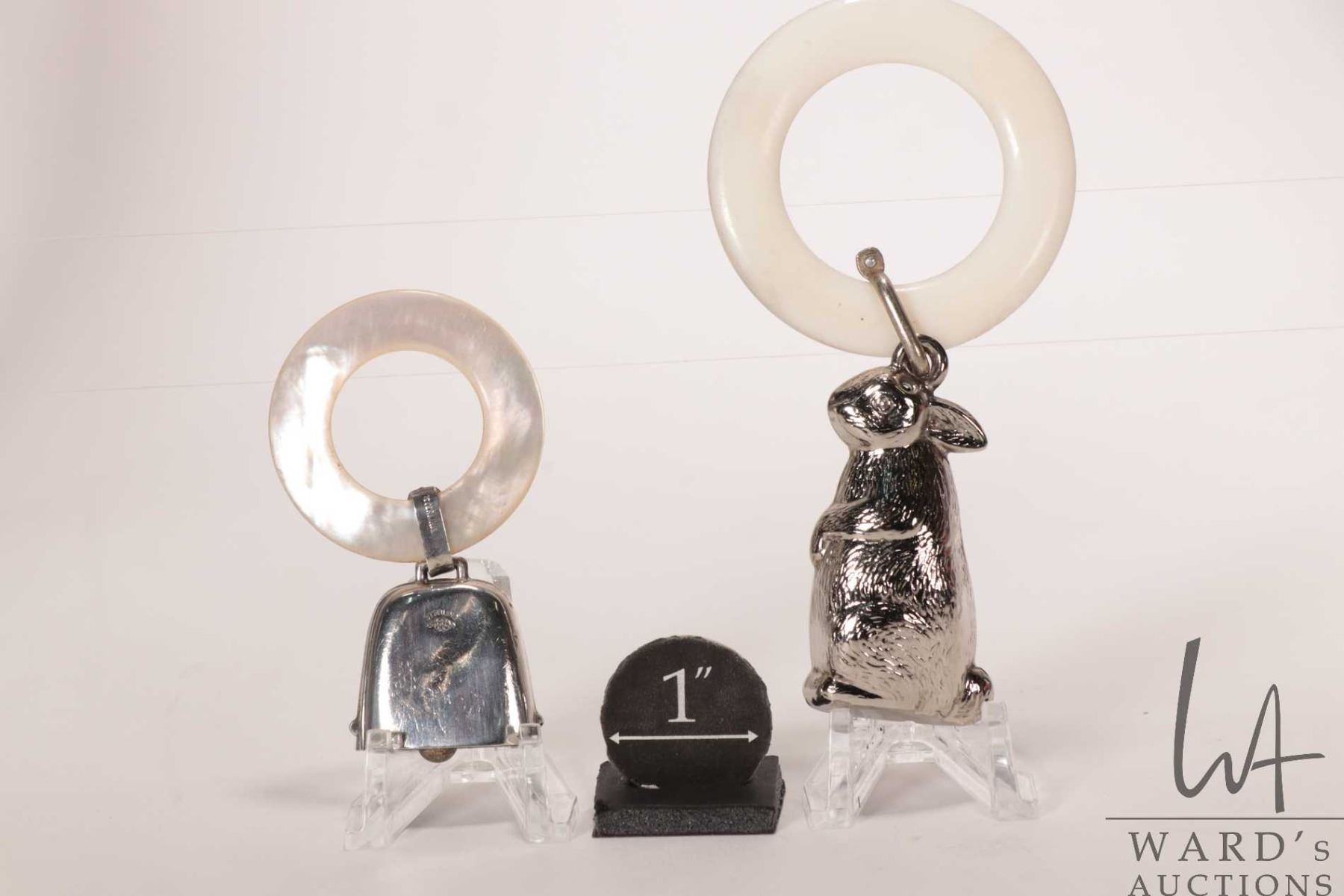 British sterling silver rabbit motif baby bell toy and a silverplate rabbit motif toy