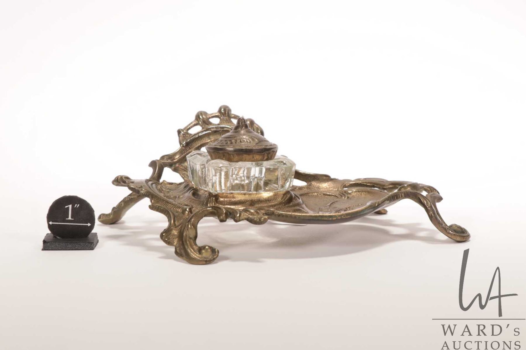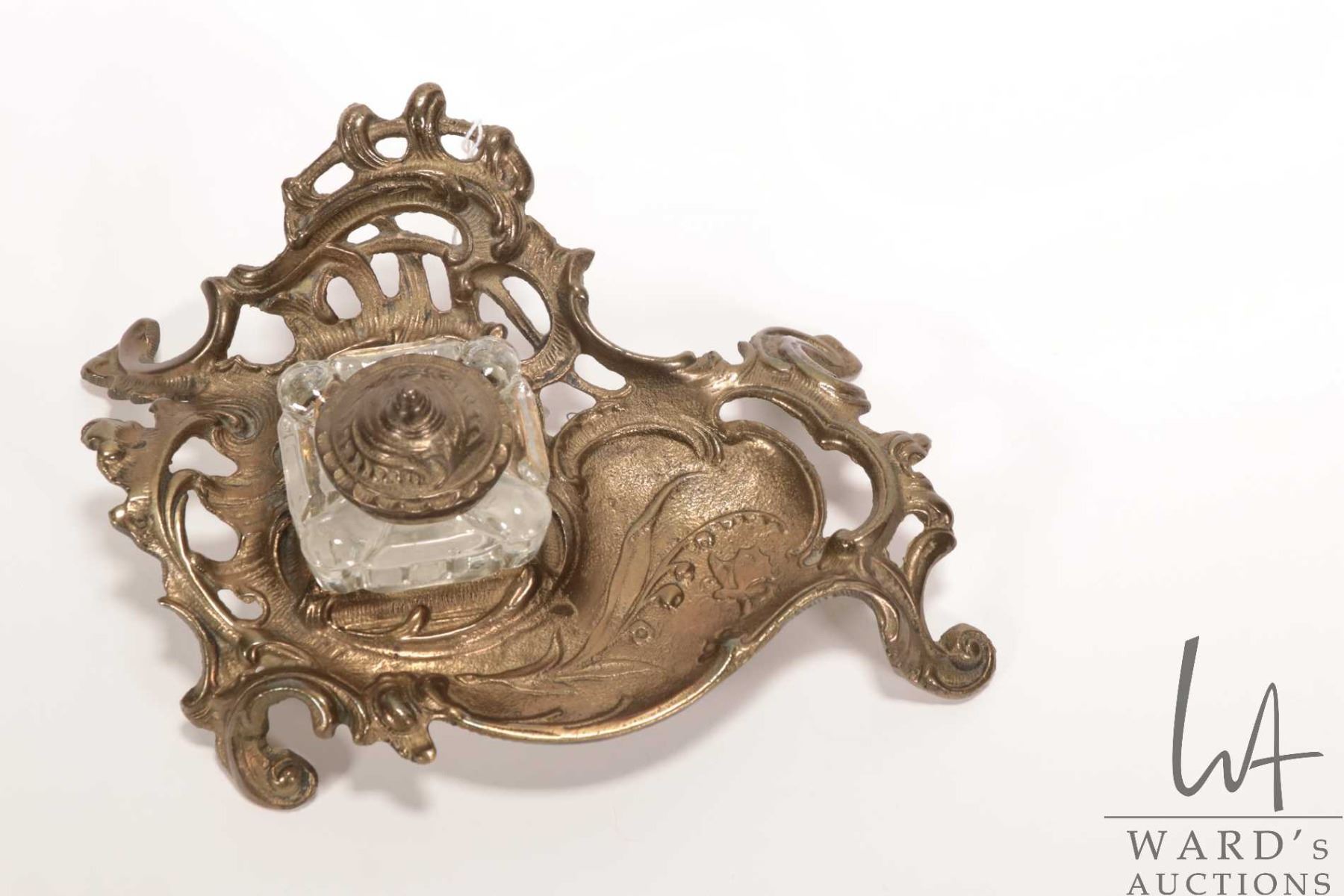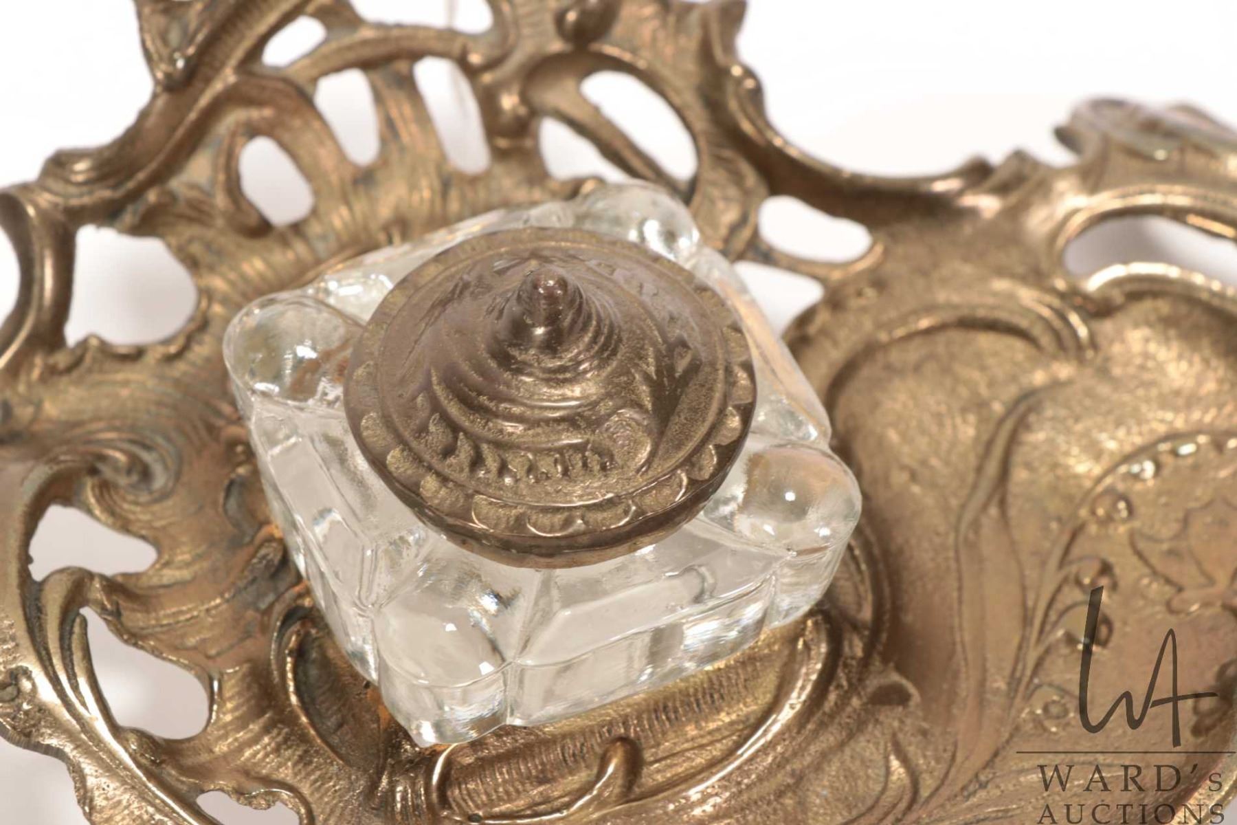 Bronze Rococo style ink stand with glass inkwell 8" wide