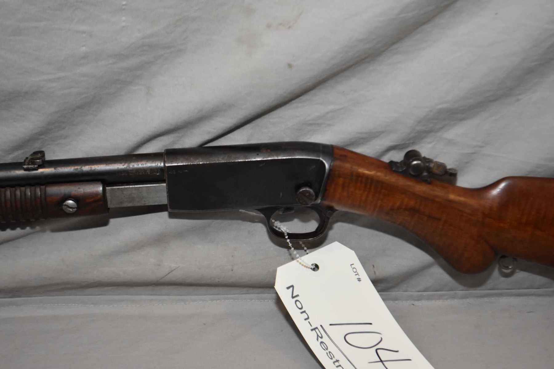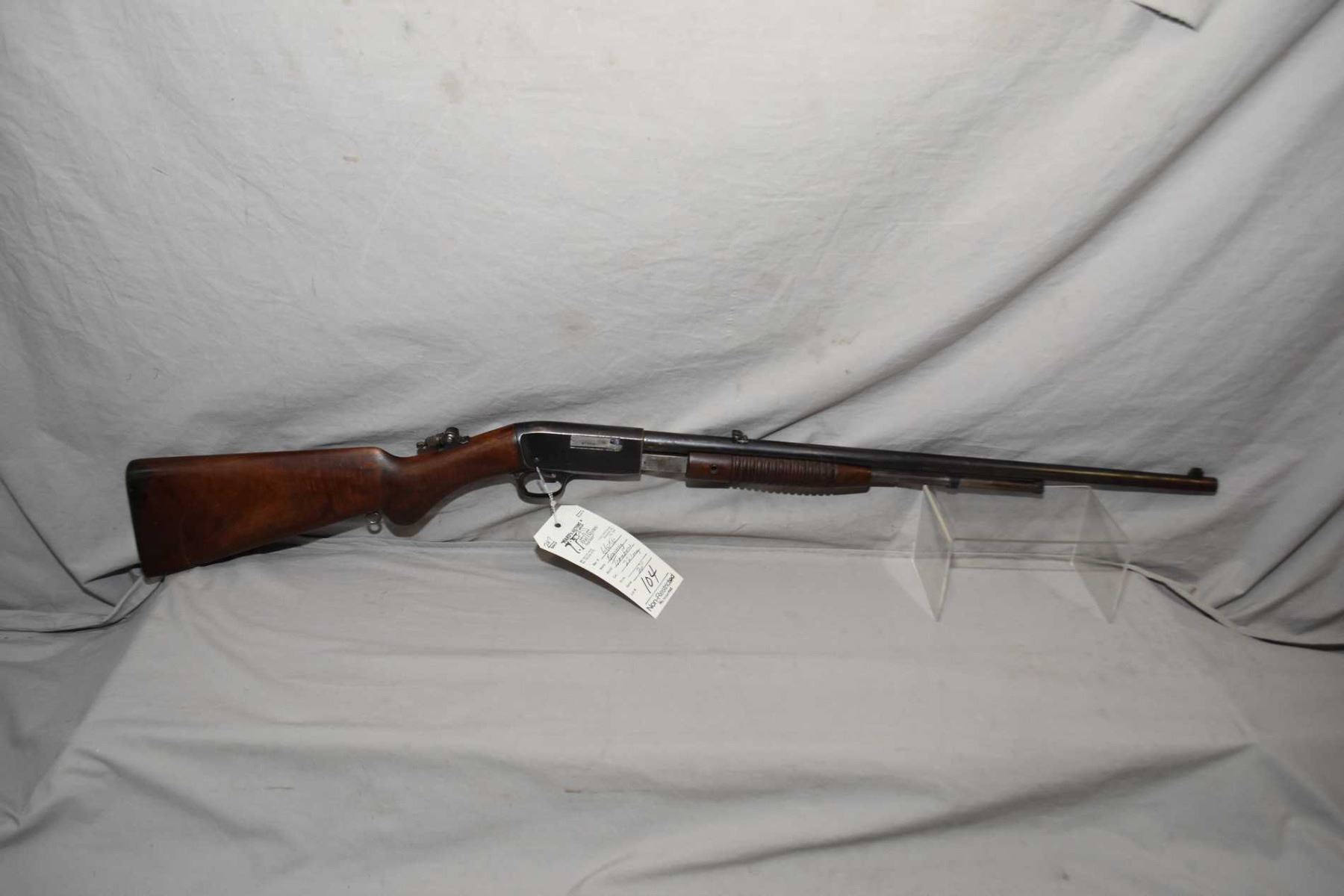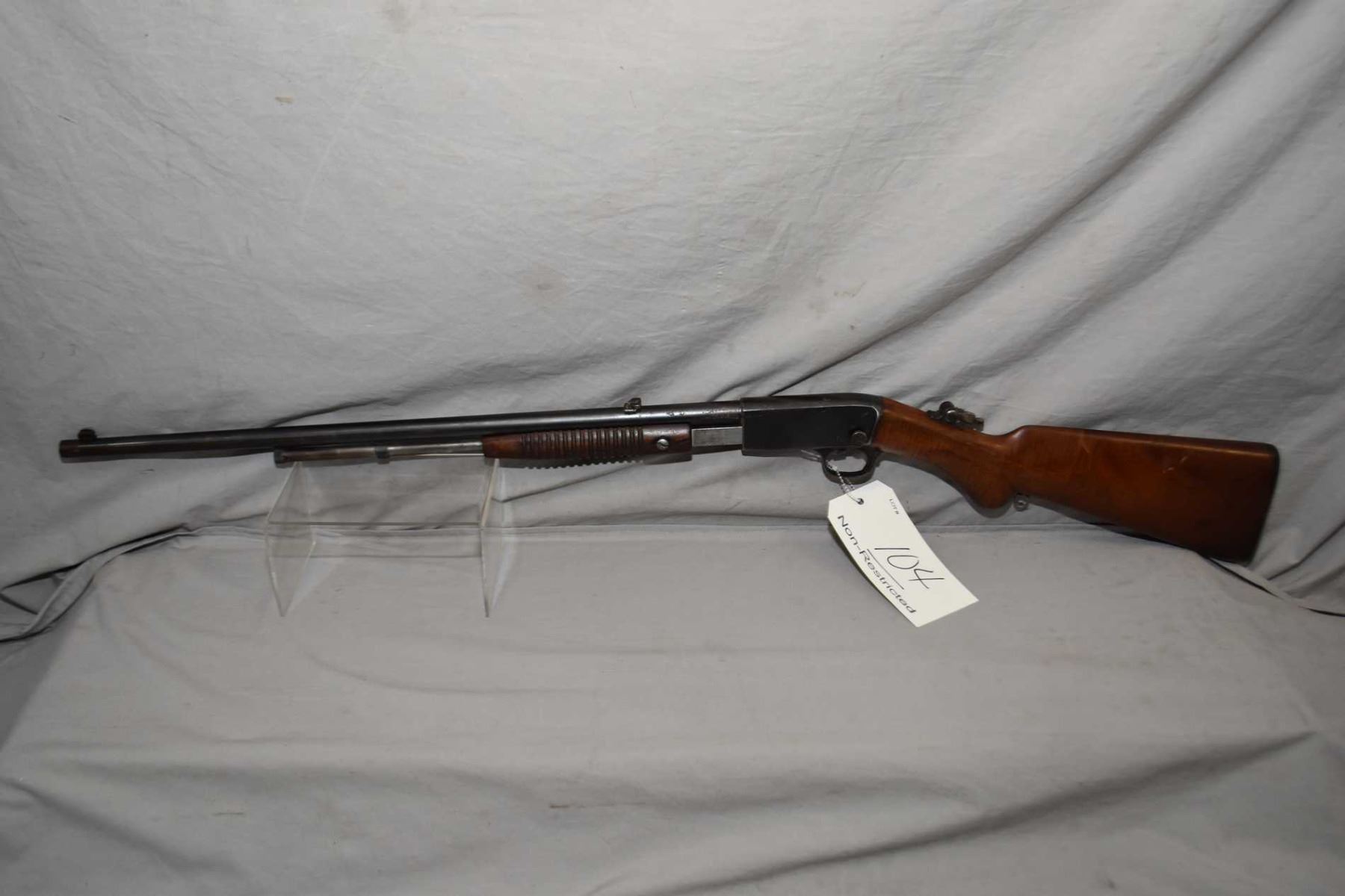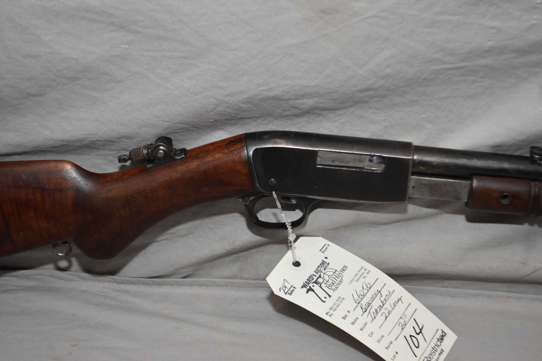 Browning ( Belgium) Model Trombone .22 Long ONLY Cal Tube Fed Pump Action Rifle w/ 22" bbl [ fading blue finish with some surface rust and pitting, barrel sights, including a stock mounted tang style peep sight, rounded pistol grip stock w/ grooved forend, metal butt plate, also some marks and scratches to wood, has eye screw behind pistol grip, Note : needs work has trouble opening but is unloaded ] Ser # 66056