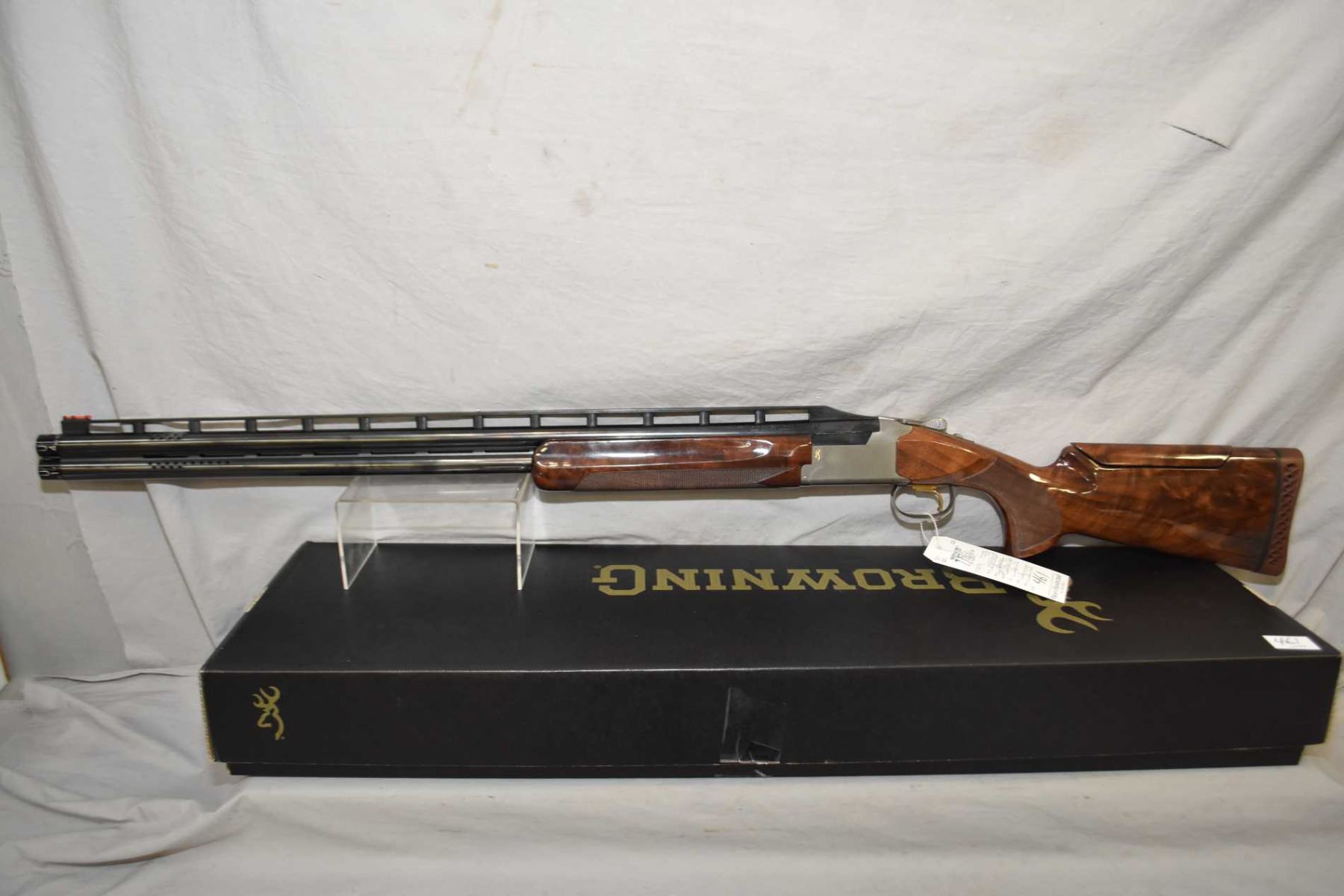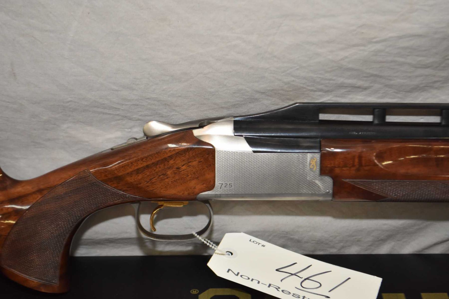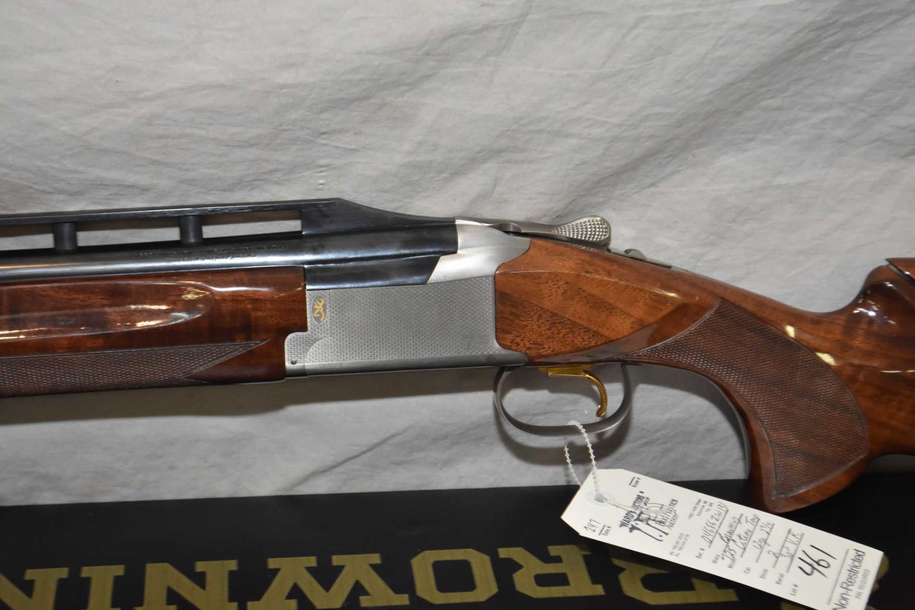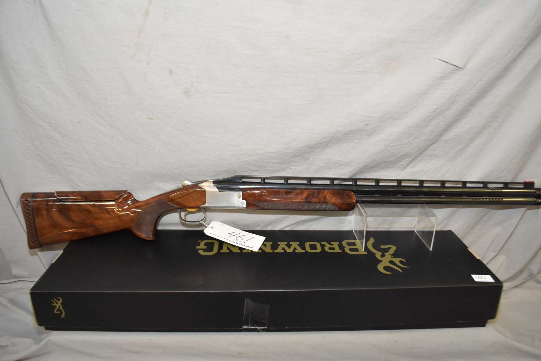 Browning Model Citori 725 Trap ADJ .12 Ga 2 3/4" Over & Under Break Action Shotgun w/ 30" blued bbls [ appears excellent, few slight marks in original box w/ booklet, etc., satin finished engraved with small ovals, gold plated trigger, deluxe high gloss finished checkered pistol grip stock with adjustable comb, and Browning recoil pad, single trigger ejector ] Ser # 04686ZW131