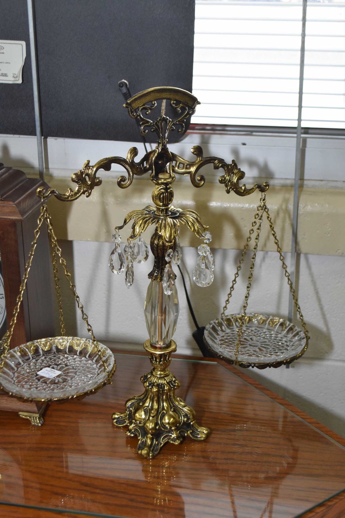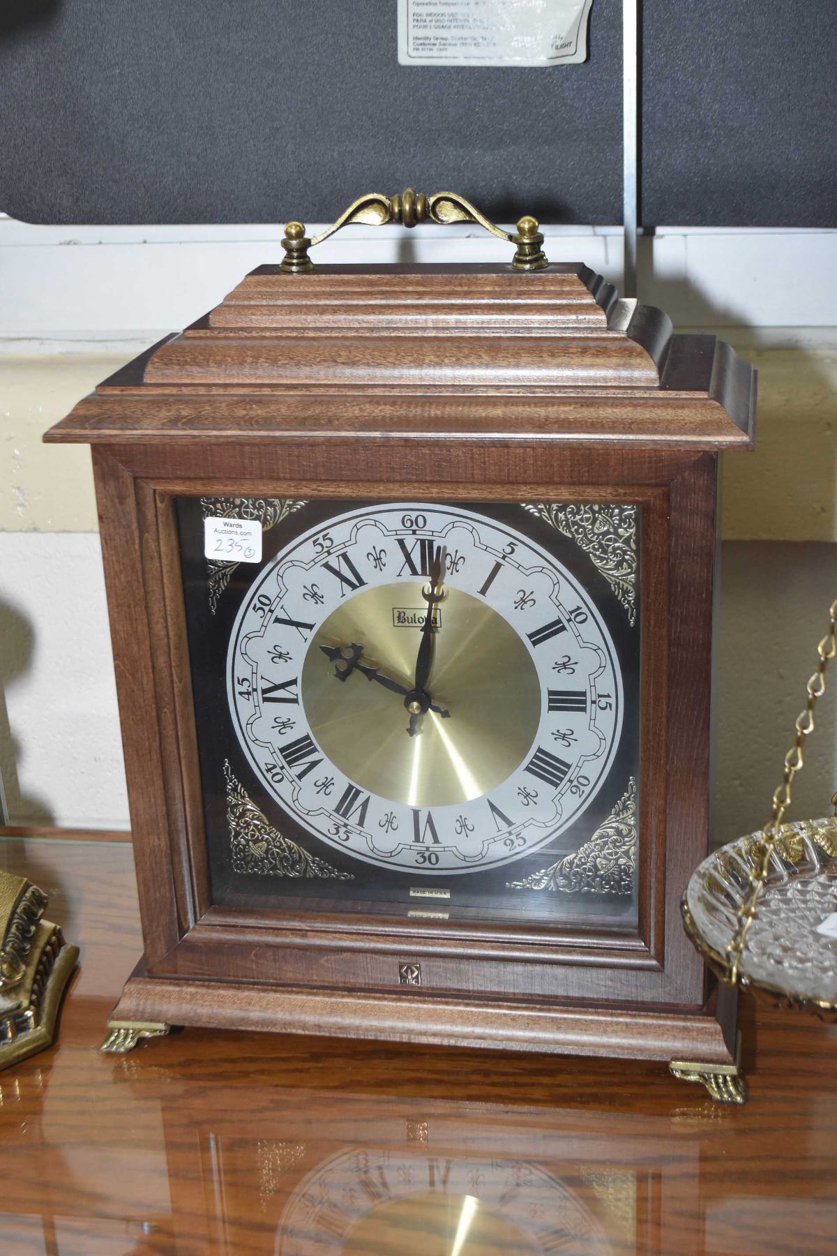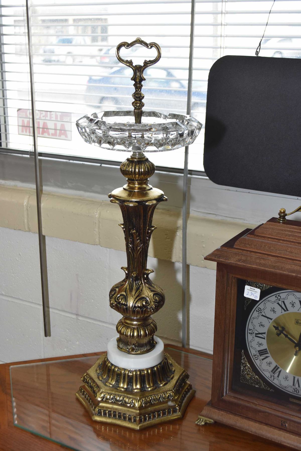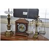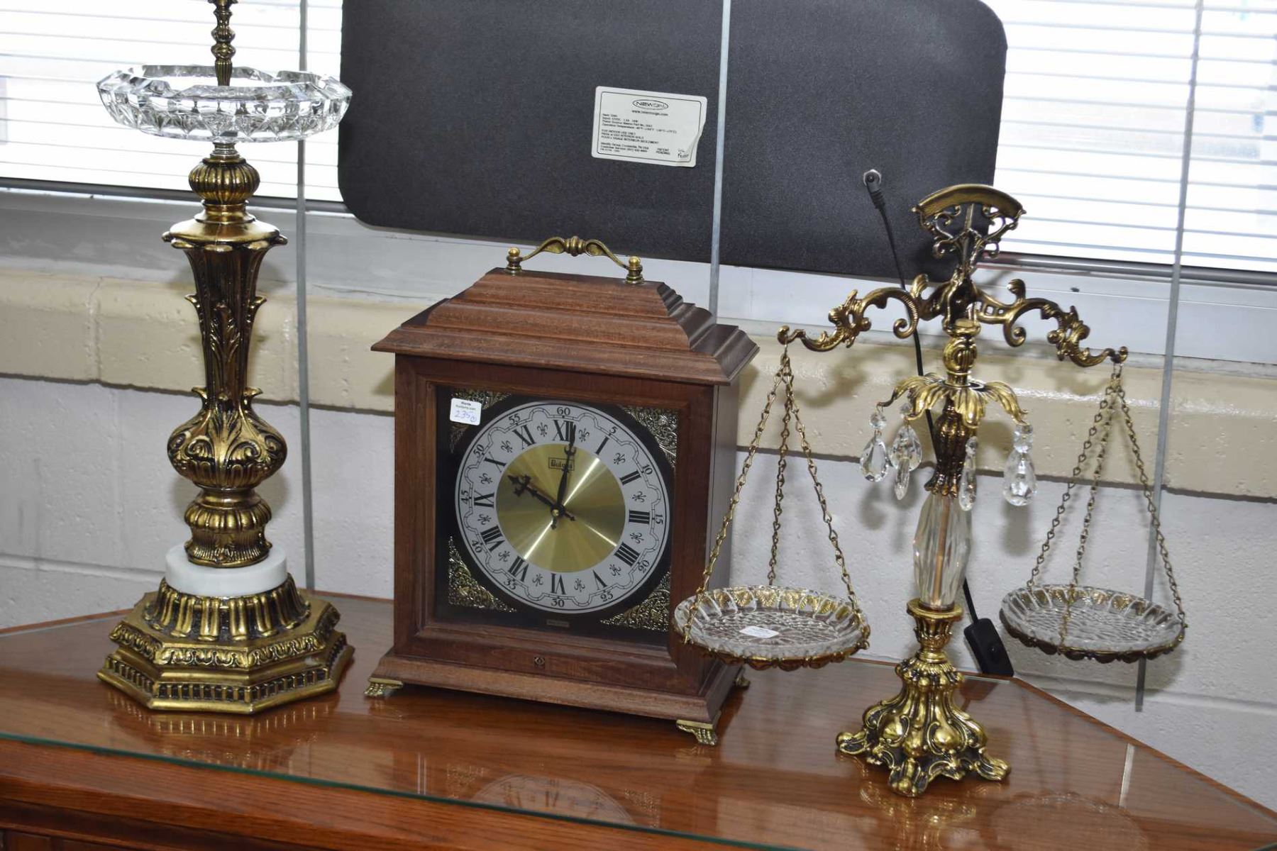 Bulova quartz mantle clock, glass standing ashtray and a complimenting decor weigh scale