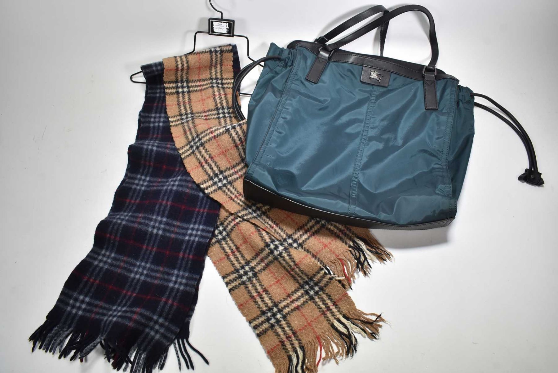 Burberry lined nylon zippered shopping bag and two Burberry wool scarves