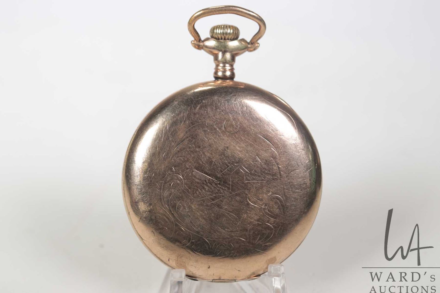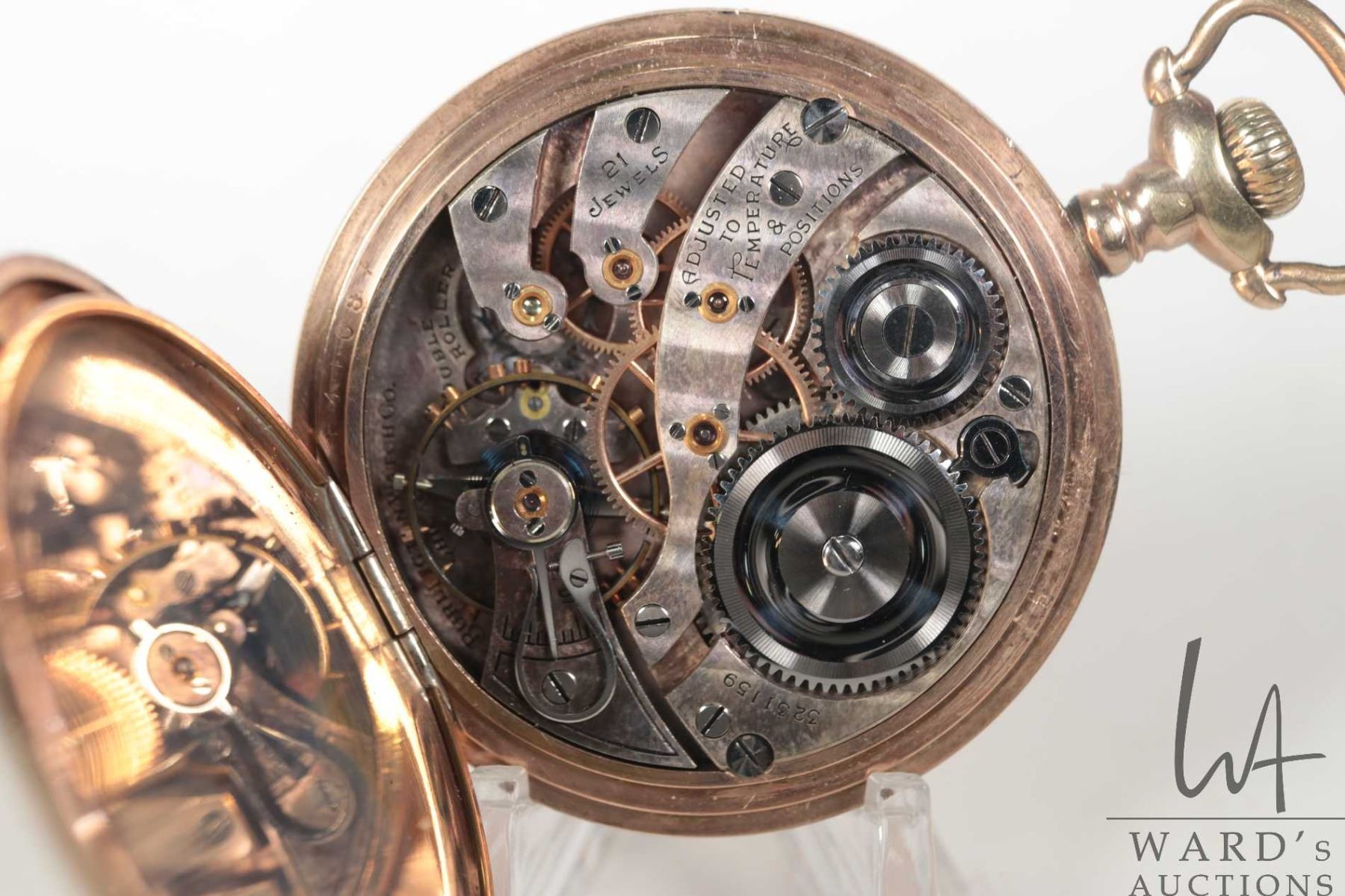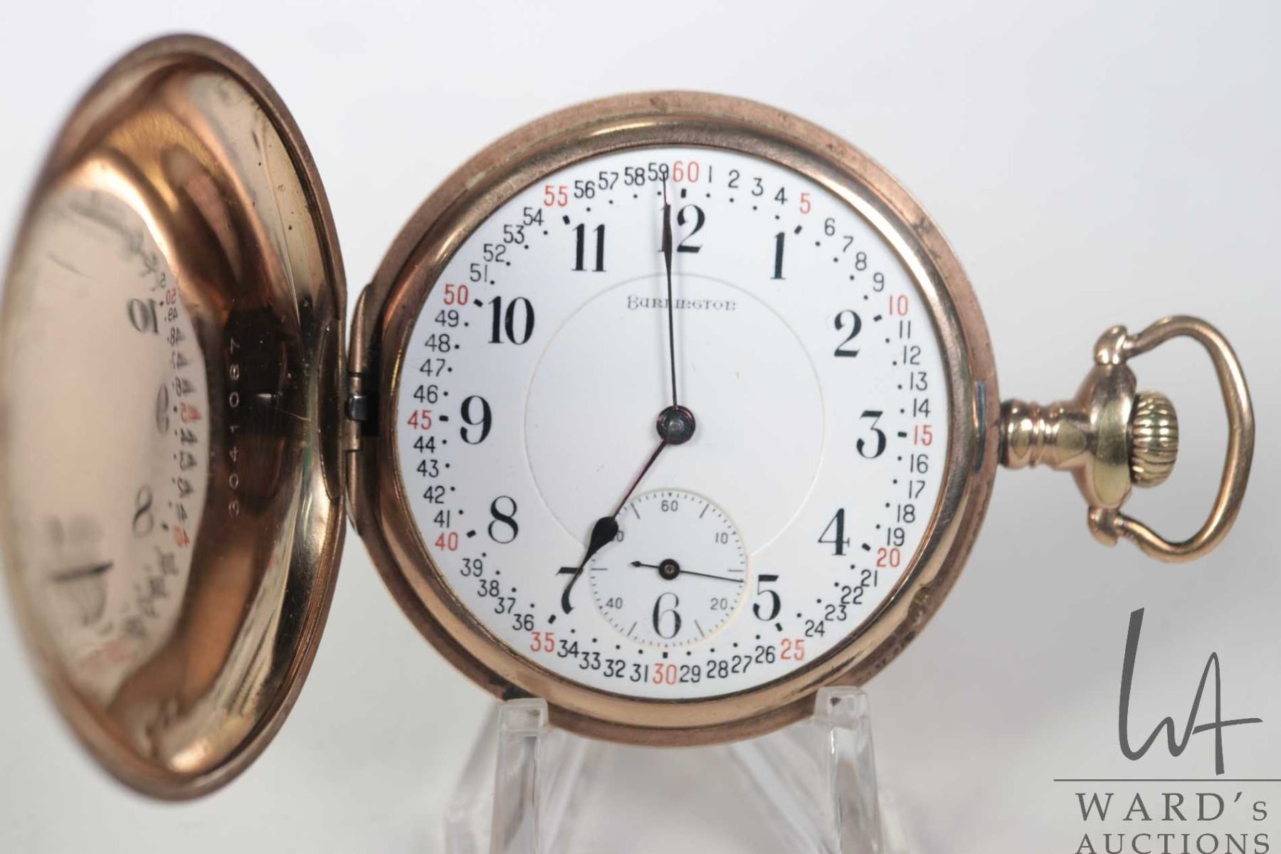 Burlington pocket watch, grade 108, model 6, serial no. 3231159, size 16S, 21 jewel in gold filled Burlington watch Co. double hunter case, note missing crystal, working at time of cataloguing