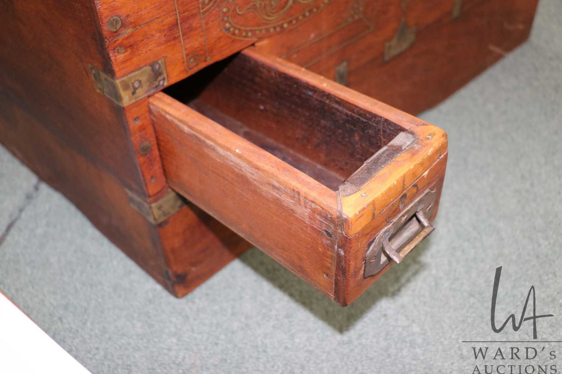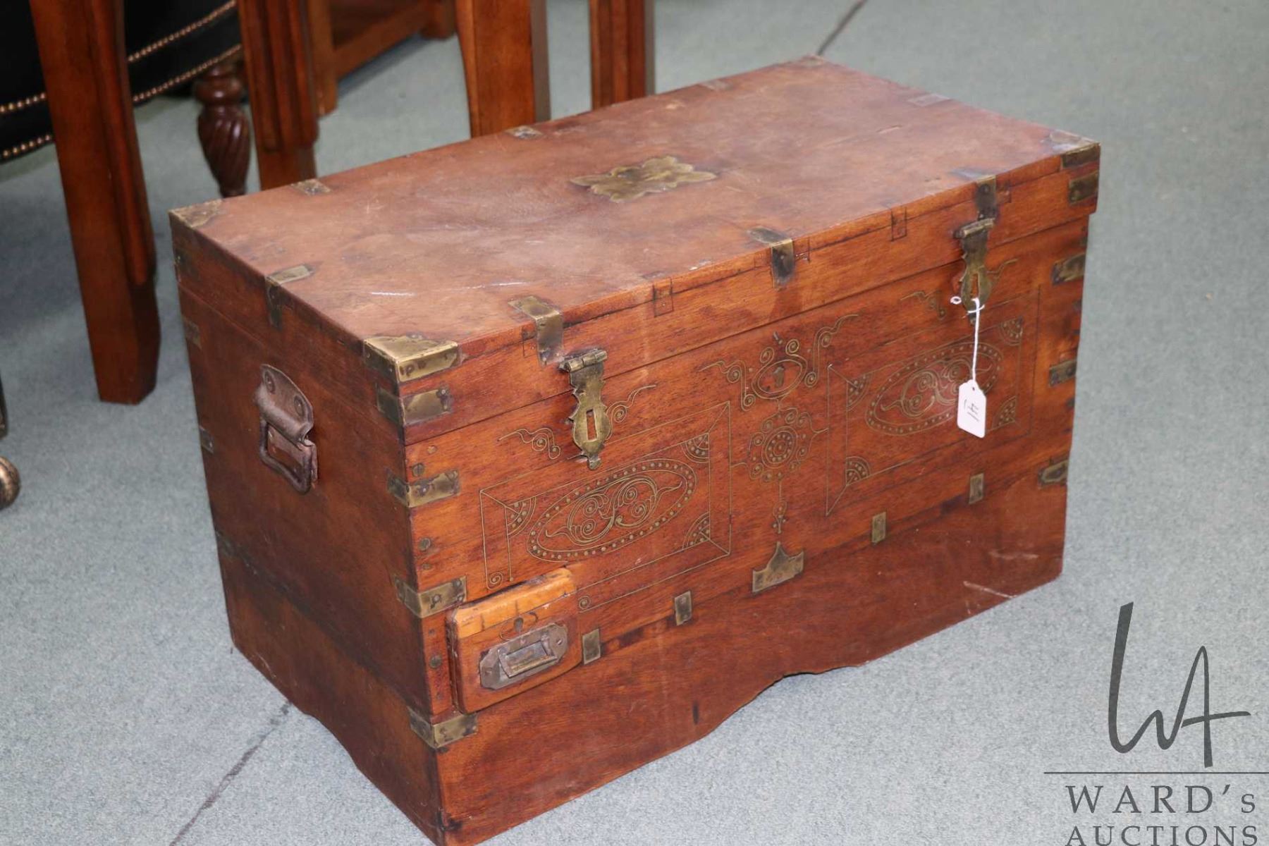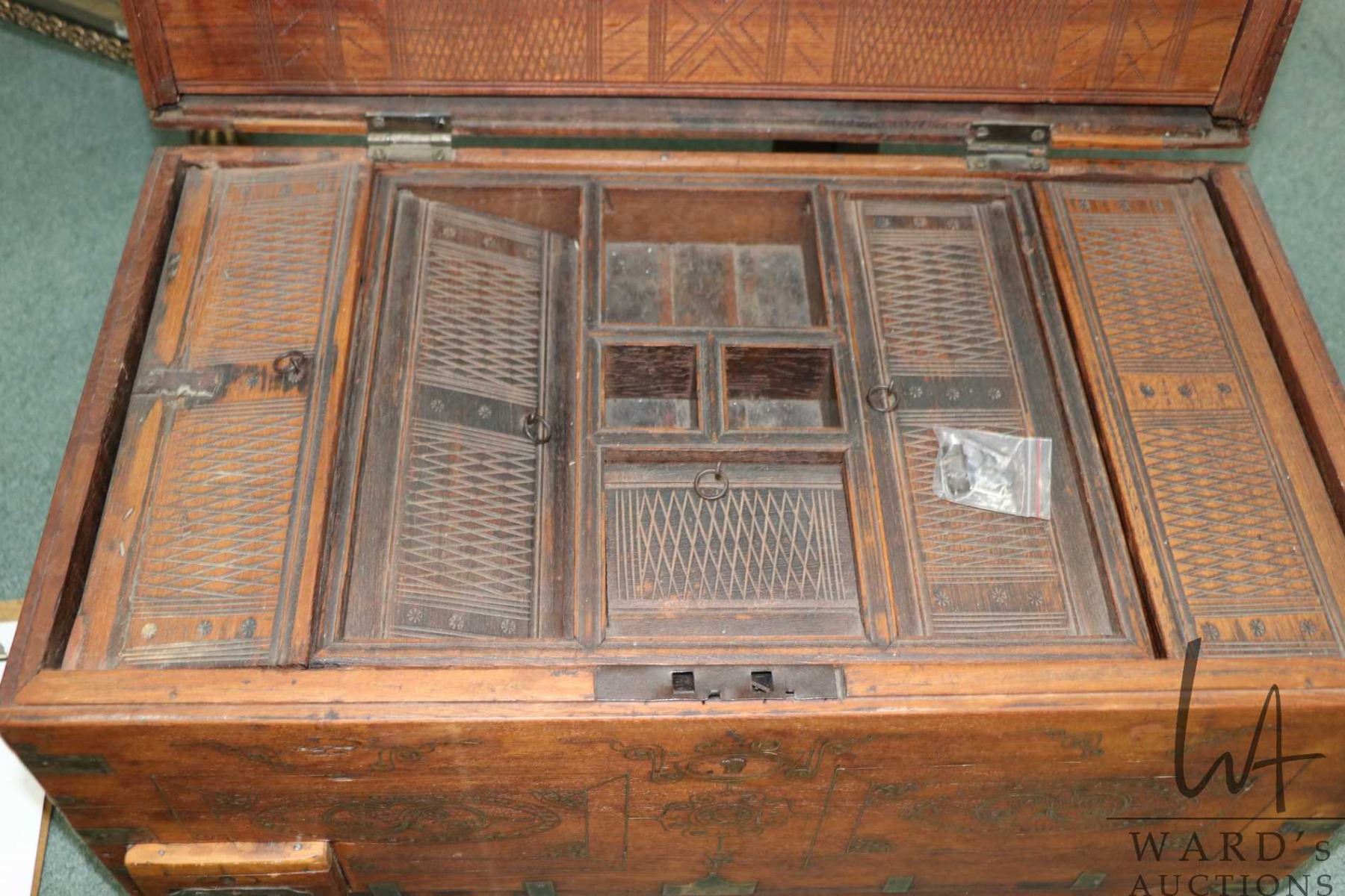 Burmese Mandalay chest with fitted interior, inlayed brass work and hand hammered hardware, 16 1/2" in height X 26" wide and 15" deep
