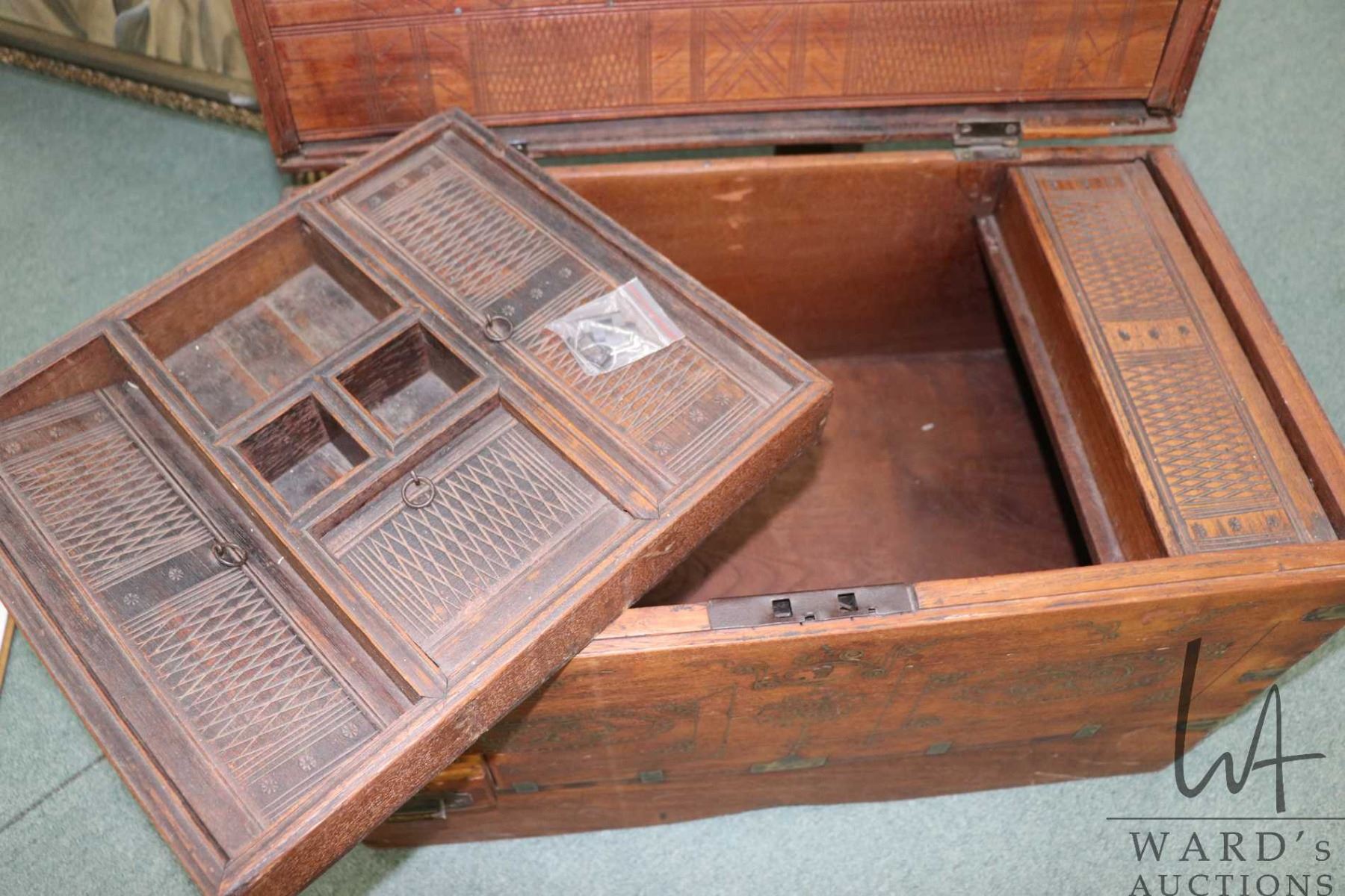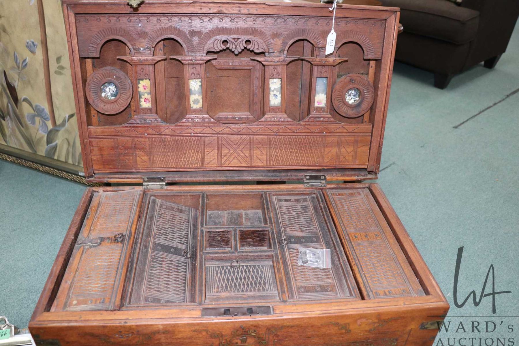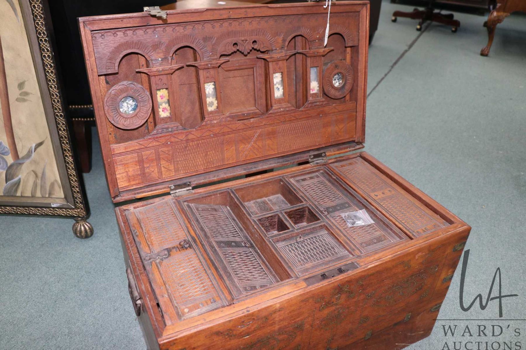 Burmese Mandalay chest with fitted interior, inlayed brass work and hand hammered hardware, 16 1/2" in height X 26" wide and 15" deep