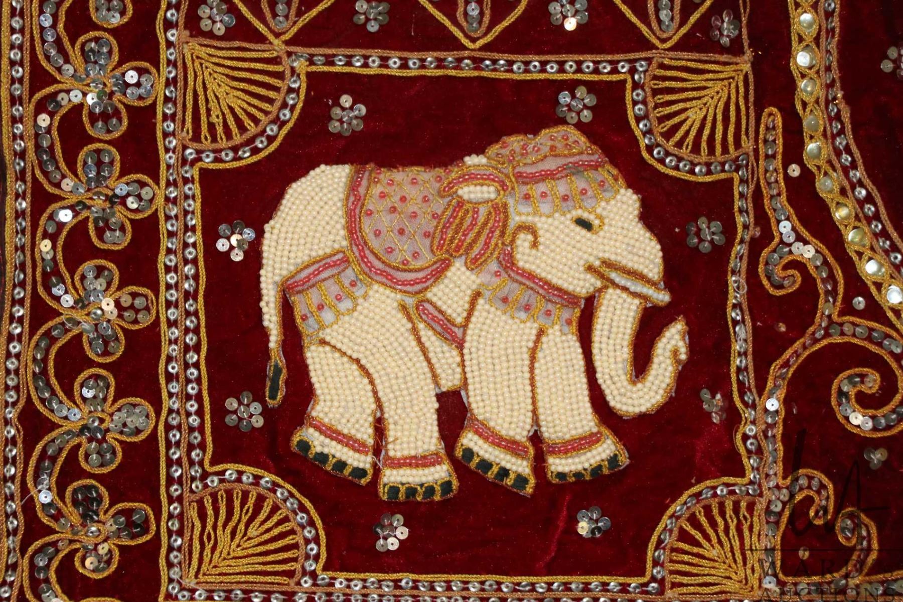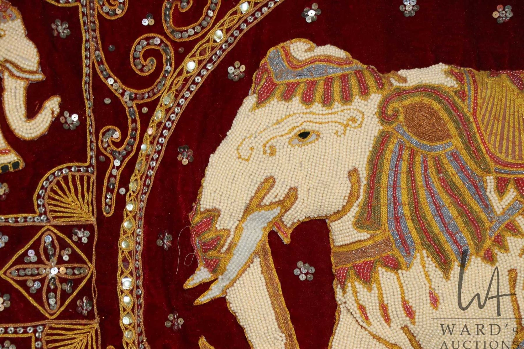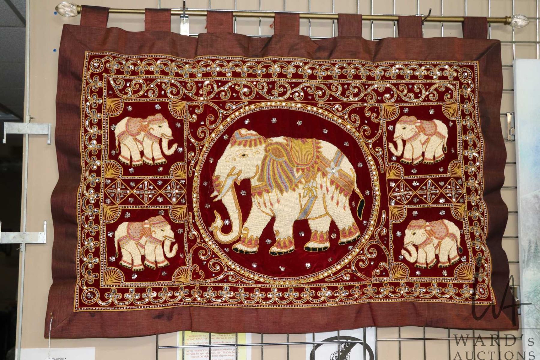 Burmese beaded elephant motif wall hanging. Measures 35" x 53". Includes hanging rod