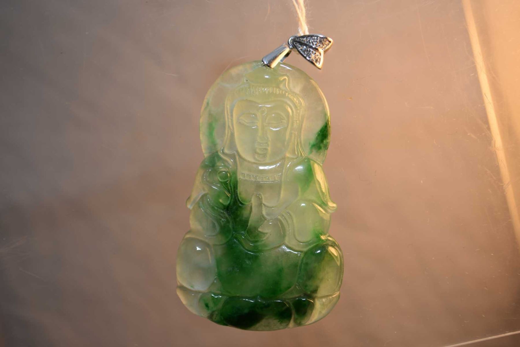 Burmese spinach green jadeite pendant with sterling silver and clear gemstone set bail