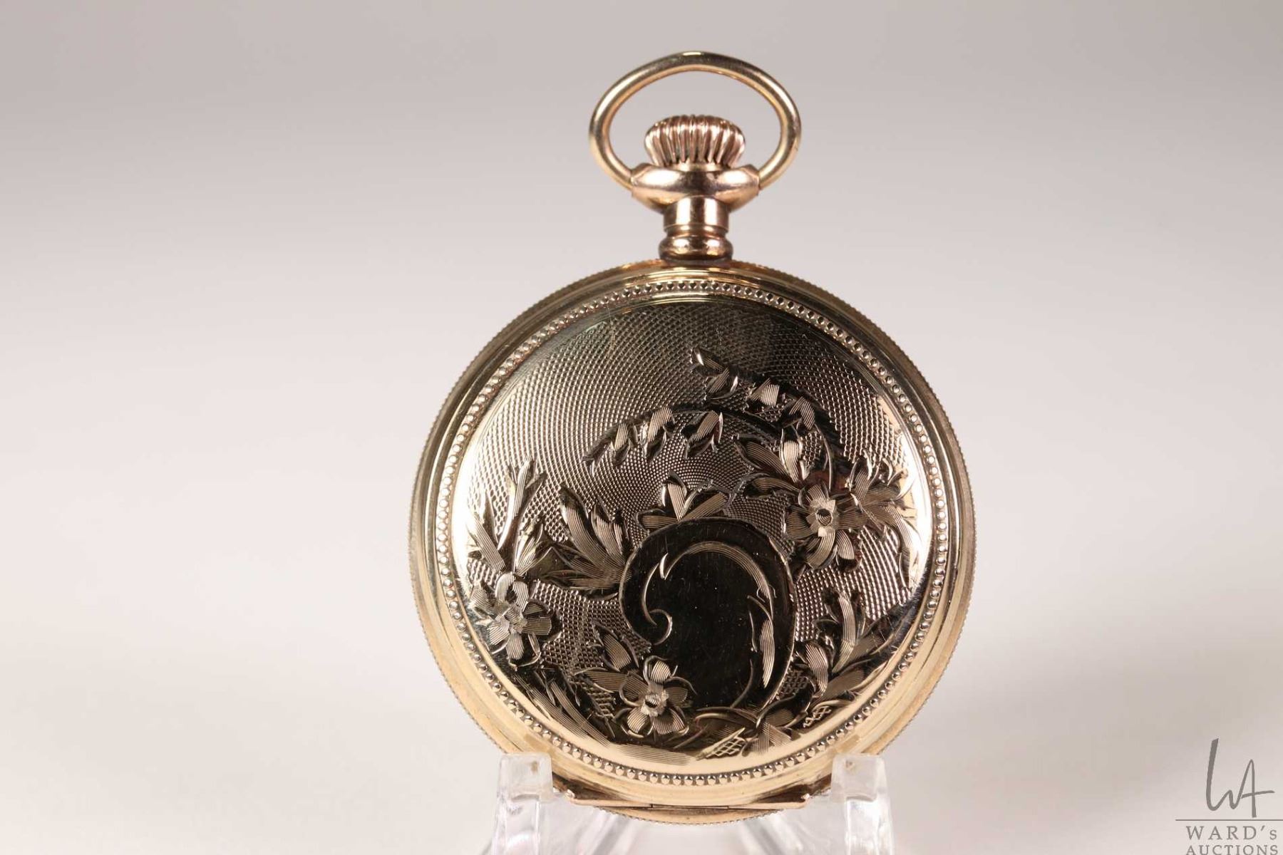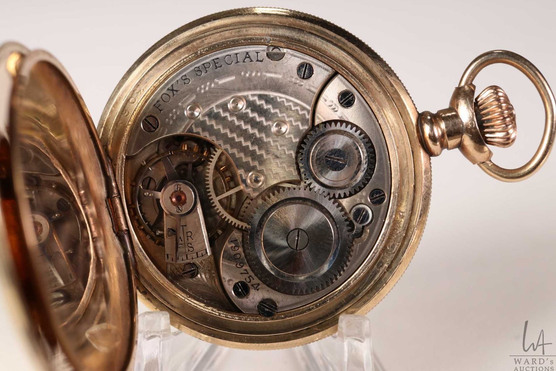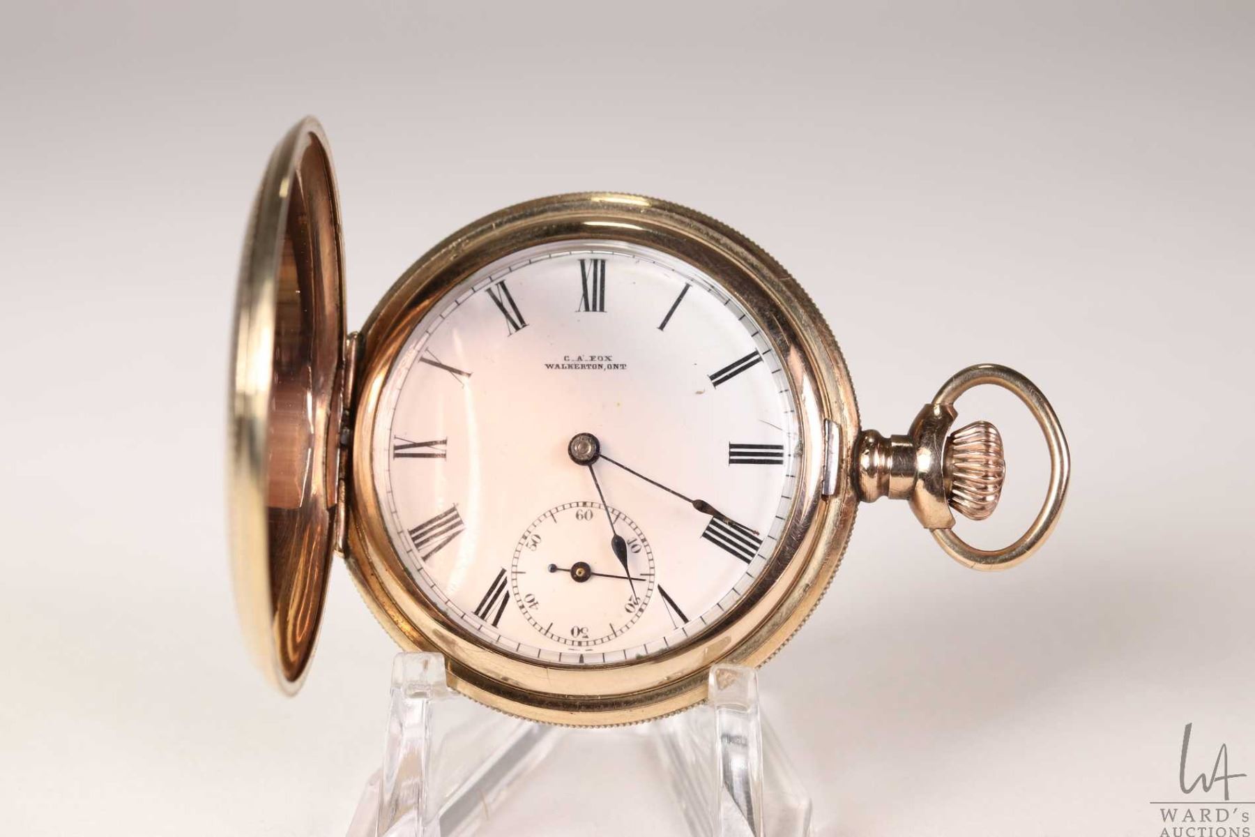 C.A. Fox "Fox's Special" Walkerton, Ontario possibly Illinois Watch Co. made pocket watch, serial no. 1909754 with white enamel dial, Roman numerals and second sweep, gold filled scroll work engraved hunter case, working at time of cataloguing