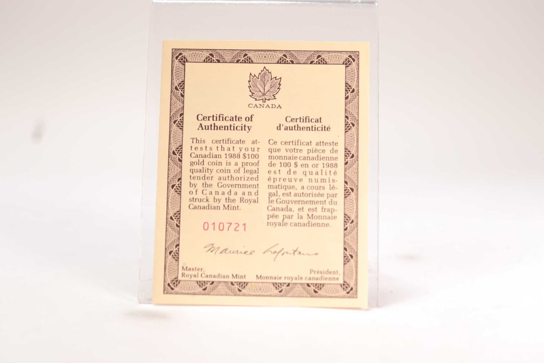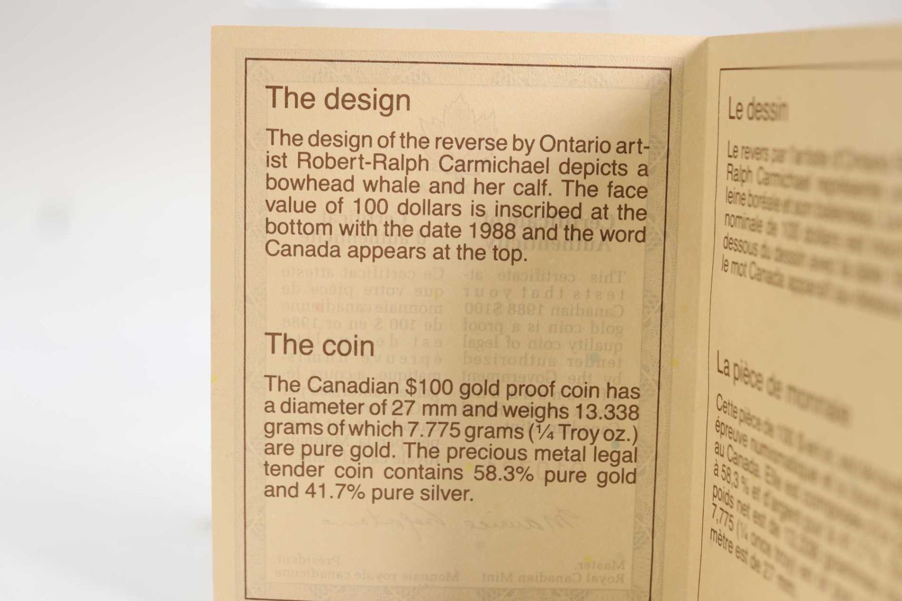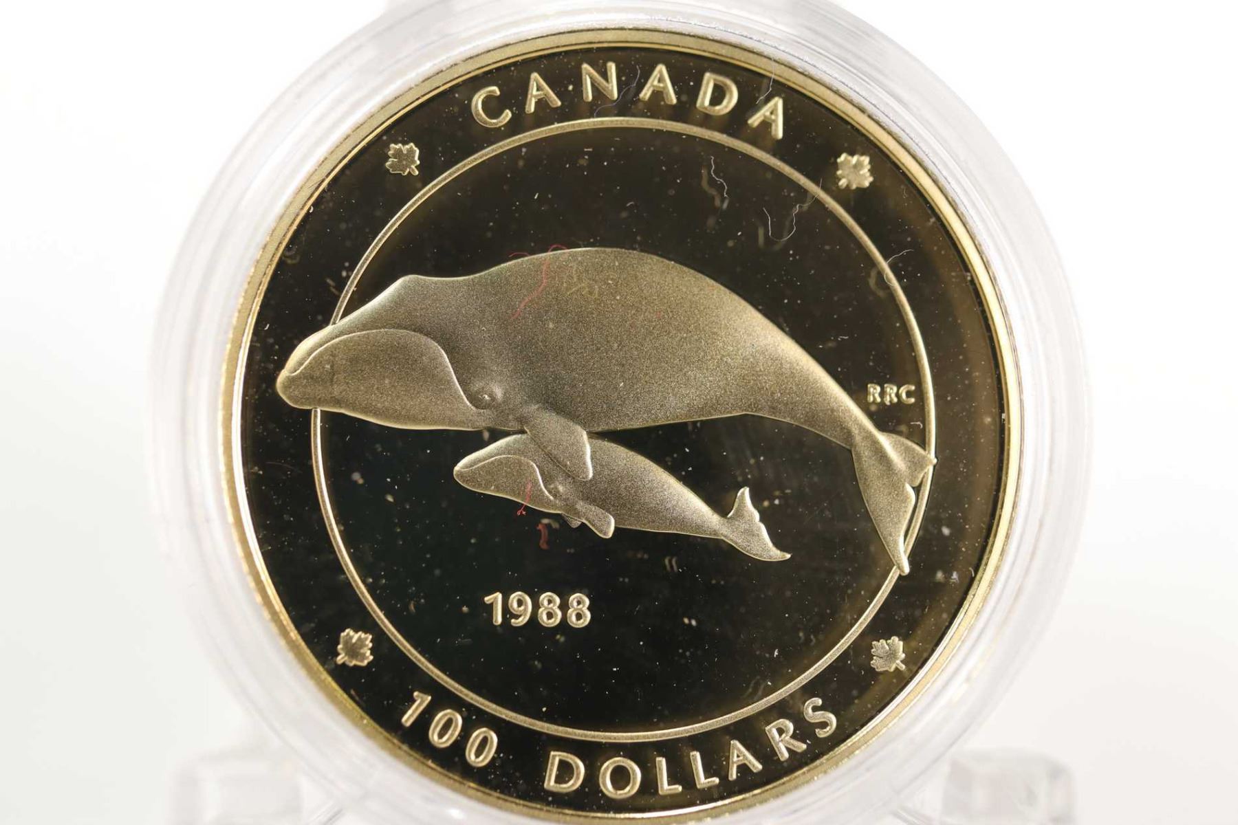 Canadian 1988 non- circulated $100 gold coin featuring a whale design by Ontario artist Robert-Ralph Carmichael, 13.338 grams of 14kt gold