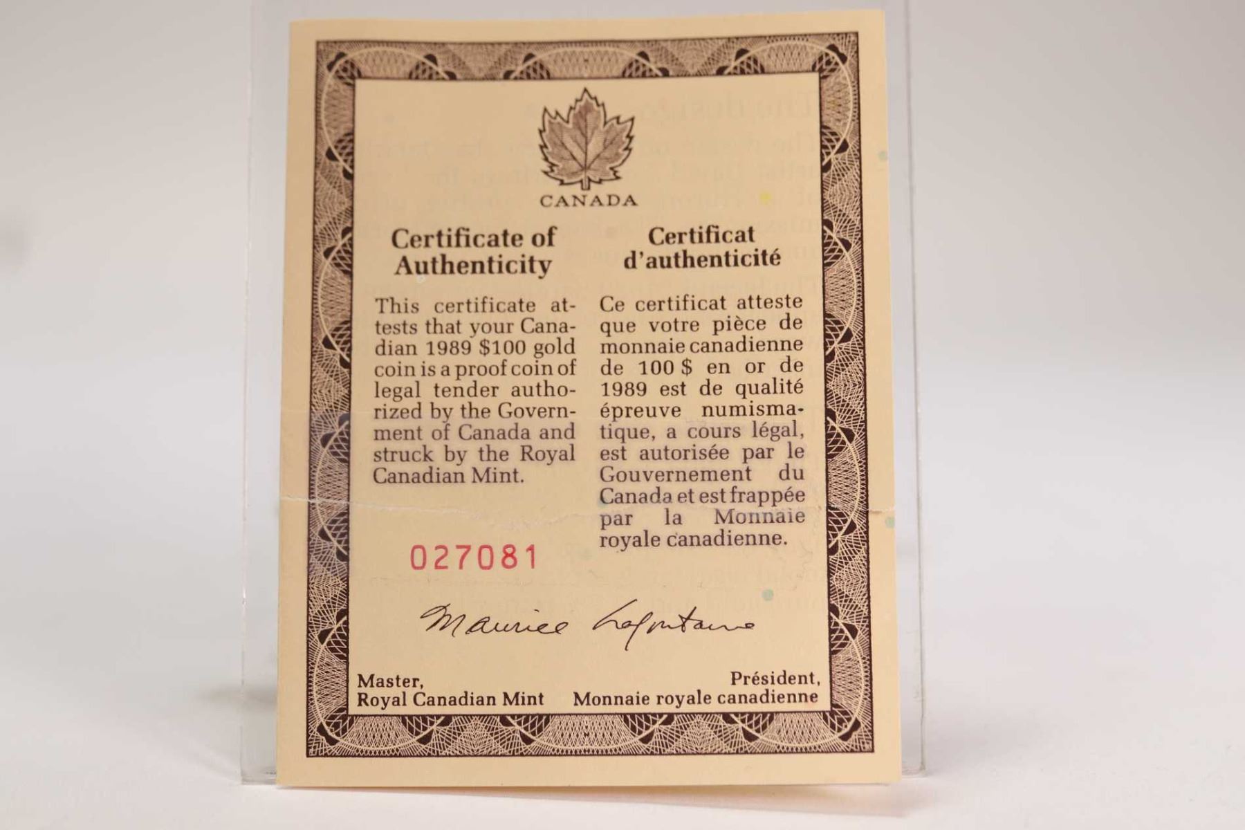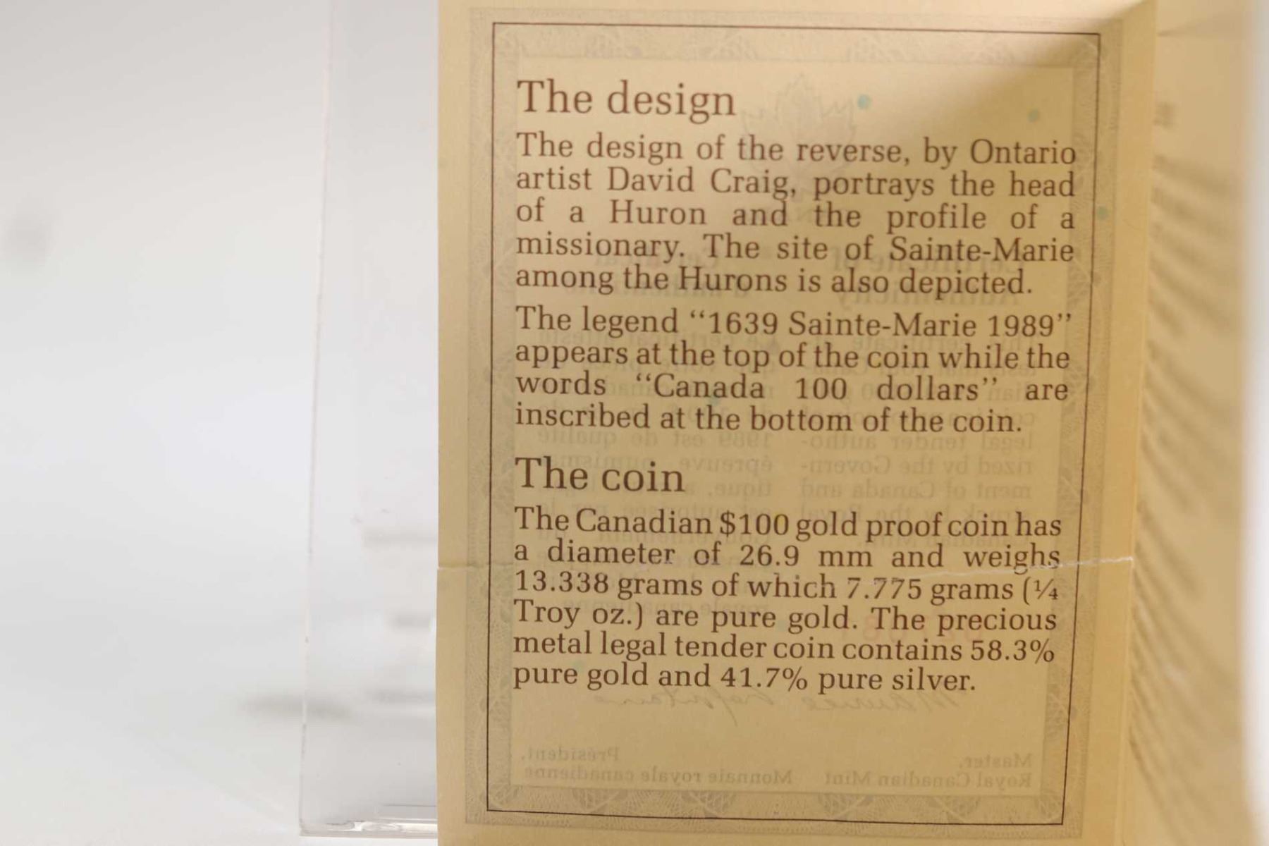 Canadian 1989 non-circulated $100 gold coin "1639-1989 Ste- Marie" , 13.338 grams of 14kt gold