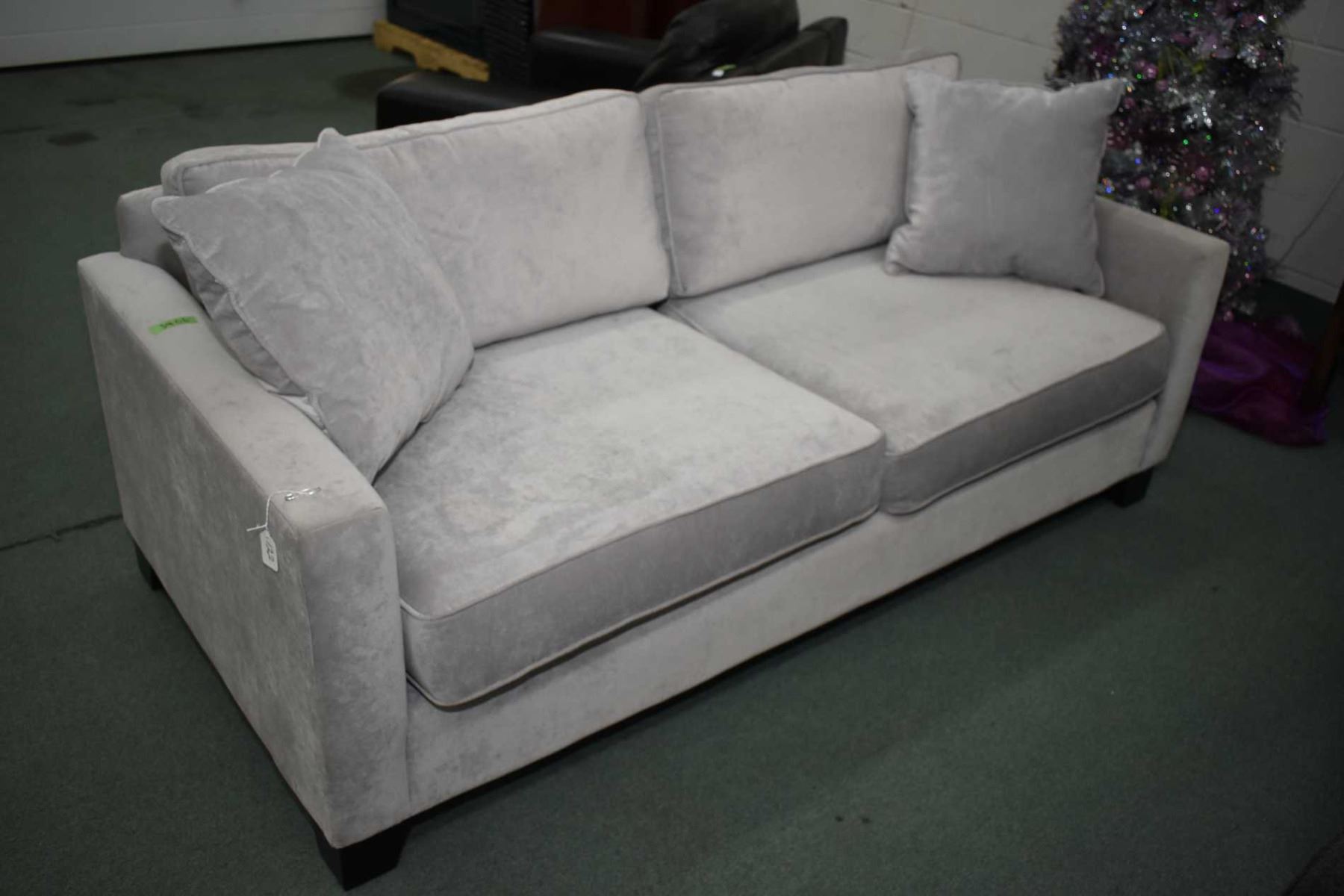 Canadian made condominium sized sofa with grey upholstery made by Urban Barn and includes two matching throw pillows