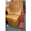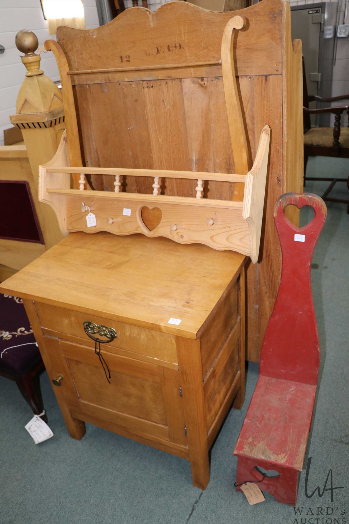 Canadiana harp back wash stand, a folk art milk stool and a wall mount coat hanger with glove shelf