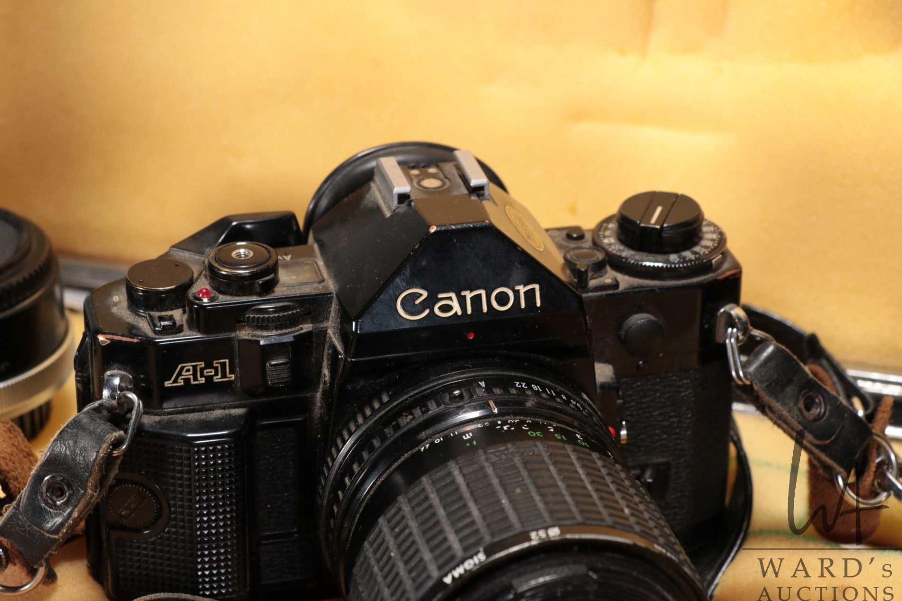 Cannon A1 35mm camera with lens plus a wide angle lens, 50mm lens, Sigma zoom lens and fitted hard c